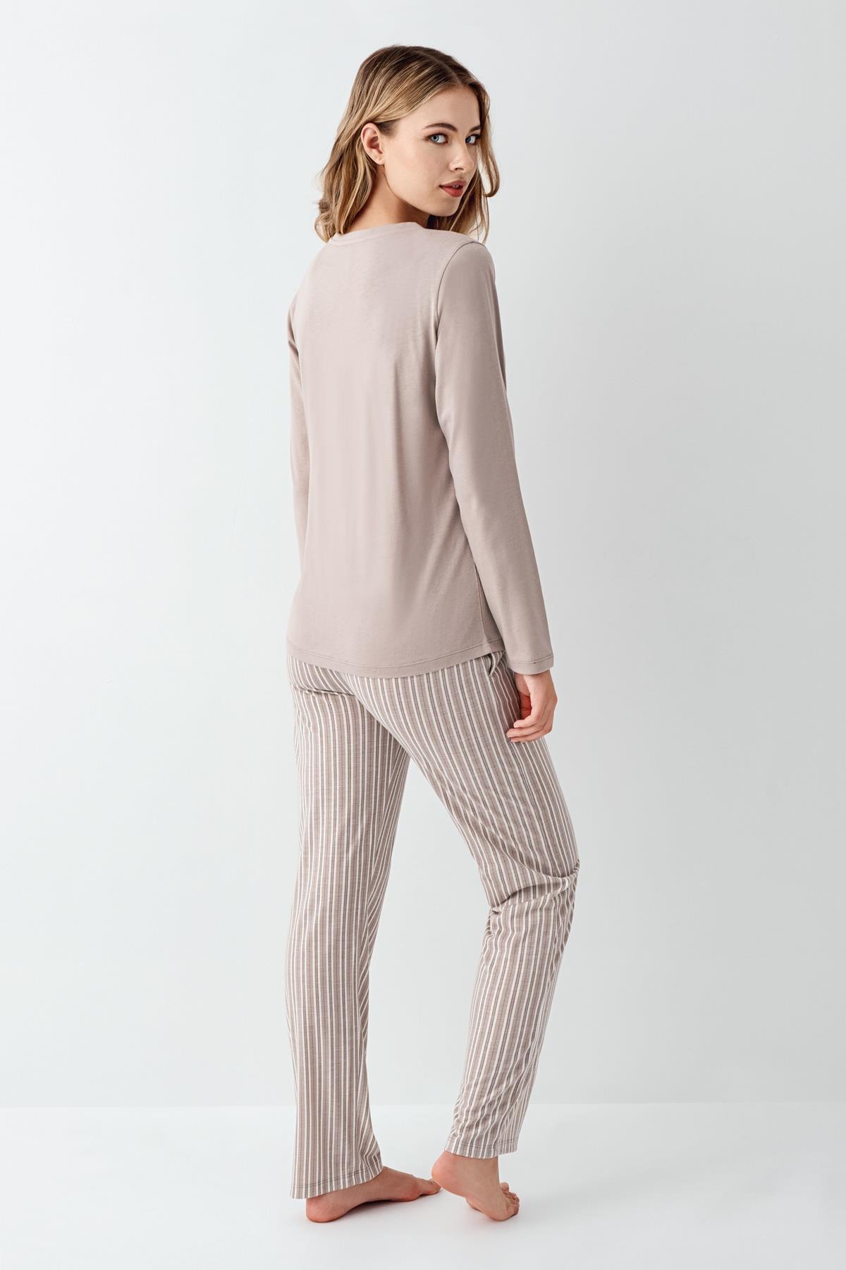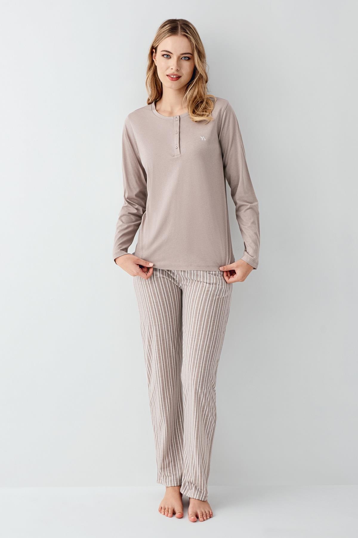 Kadın Vizon Yakası Düğmeli Pijama Takım, Alt Pijama Cepli ve Çizgili, %100 Pamuk
