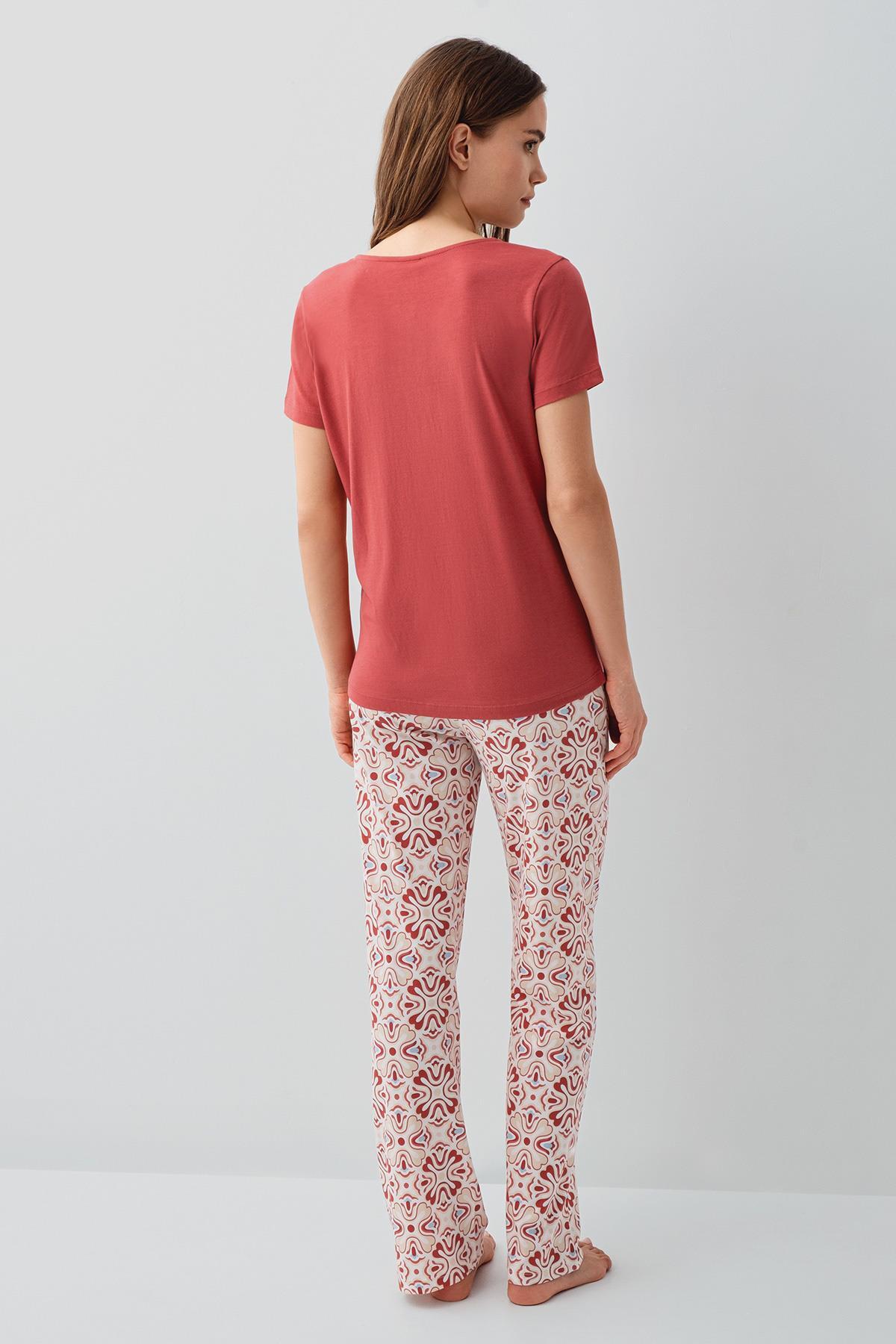 Şıklığı ve konforu bir arada sunan bu kadın pijama takımı; V yaka kısa kollu üst ve modern desenli uzun pijama altından oluşur. Sade üst tasarımı ile desenli alt uyumu, ev giyiminde zarif ve günlük bir stil sunar.