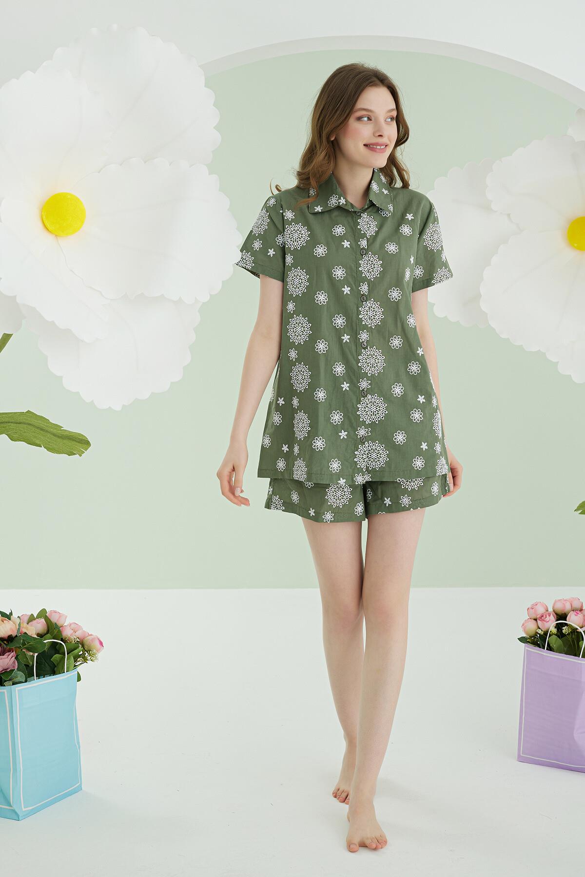 NBB %100 Pamuklu Yeşil Çiçek Desenli Şortlu Önden Düğmeli Pijama Takımı