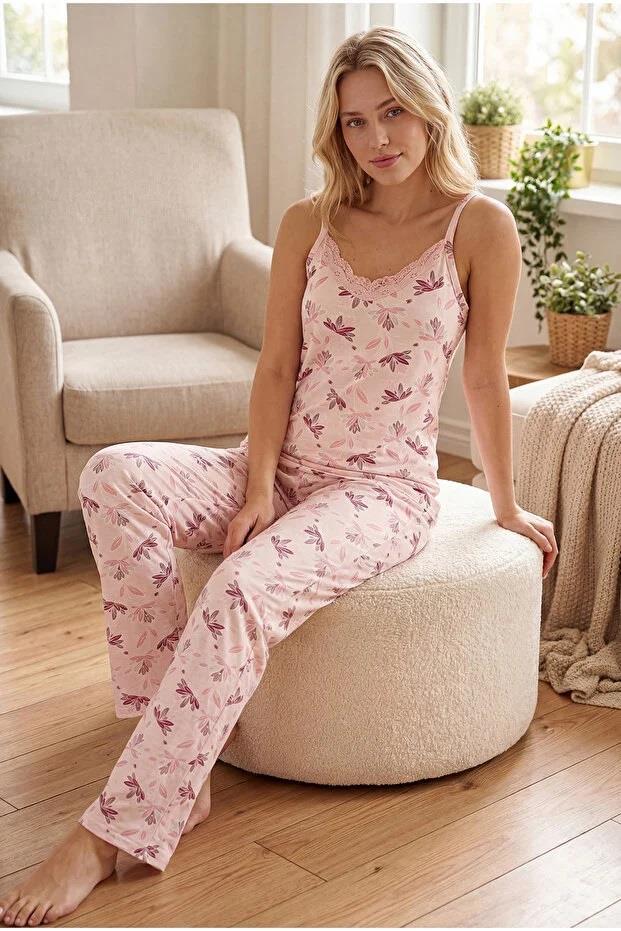 NBB Askılı Pembe Çiçekli pamuklu Pijama Takım