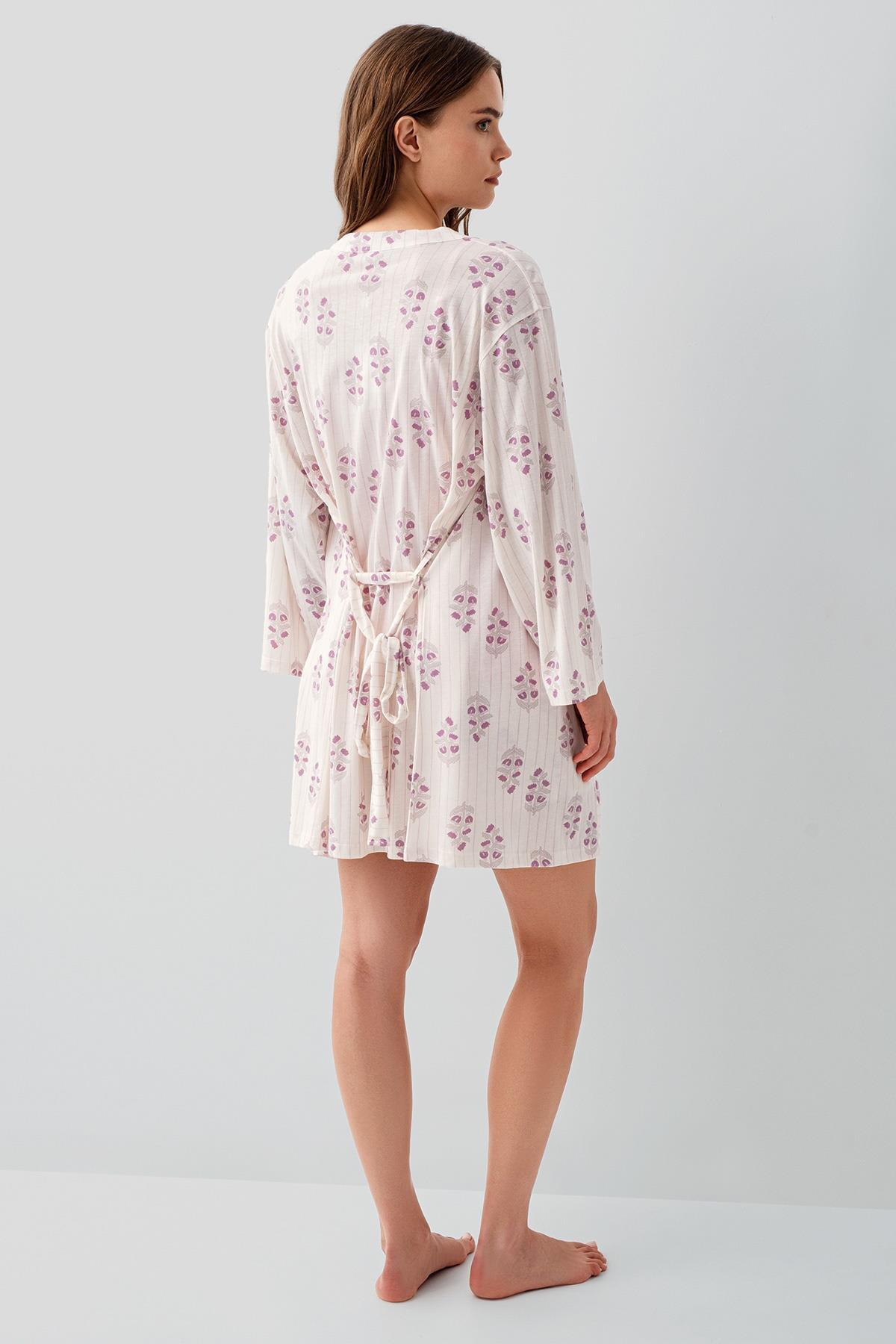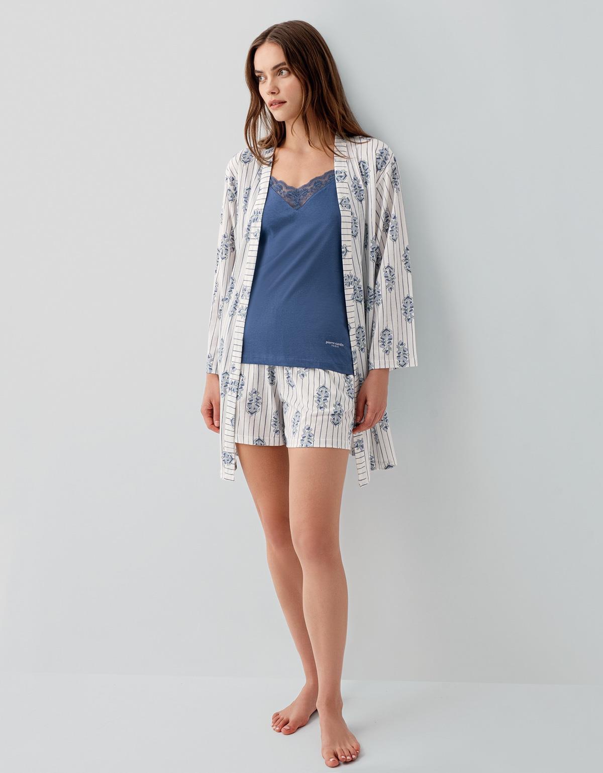 Pierre Cardin kadın 3’lü pijama takımı; askılı atlet, şort ve sabahlık olmak üzere üç parçadan oluşur.