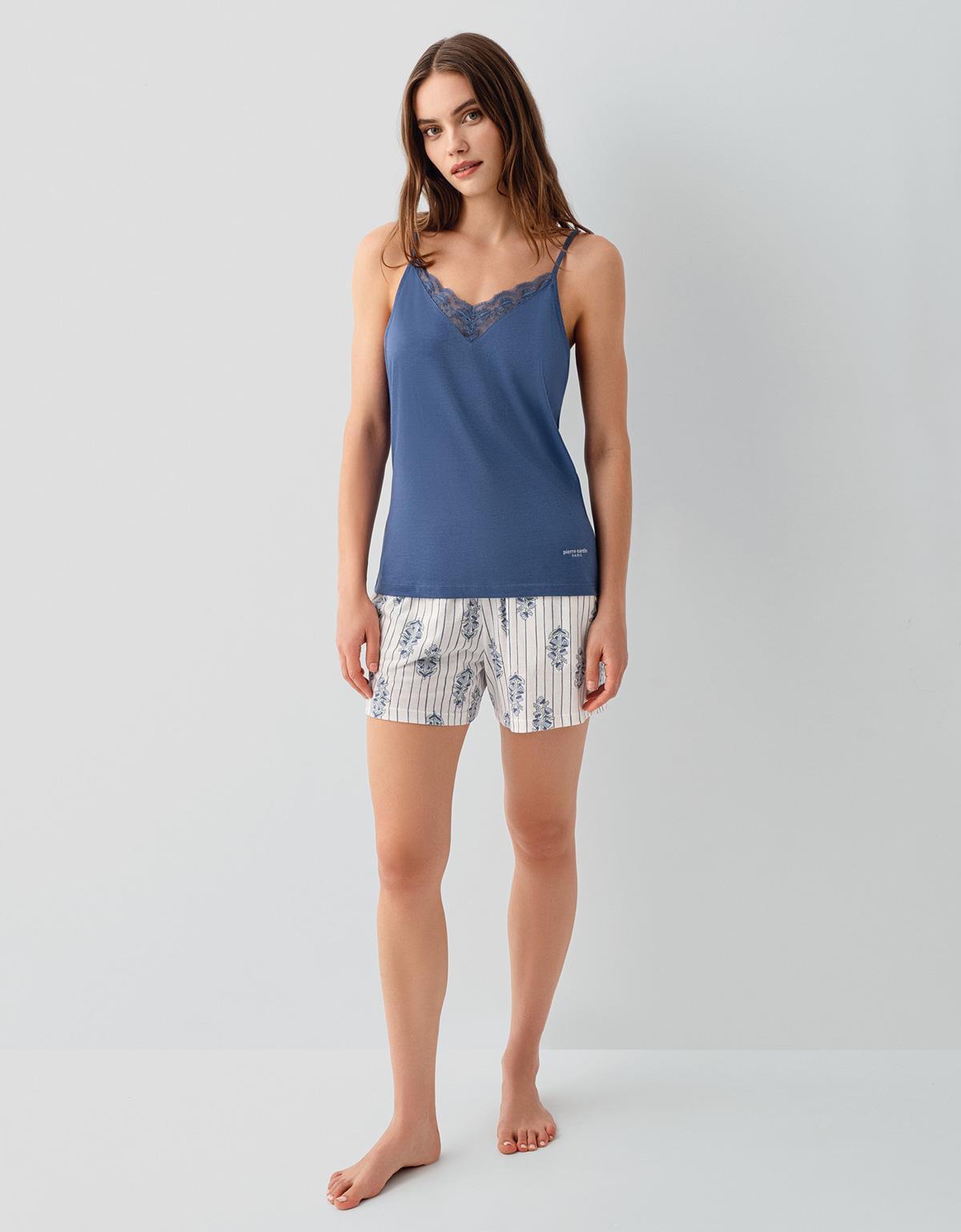 Askılı atlet kısmında yer alan zarif dantel detayı feminen bir görünüm sunarken, şort ve sabahlık ile kombinlenerek çok yönlü kullanım imkânı sağlar.