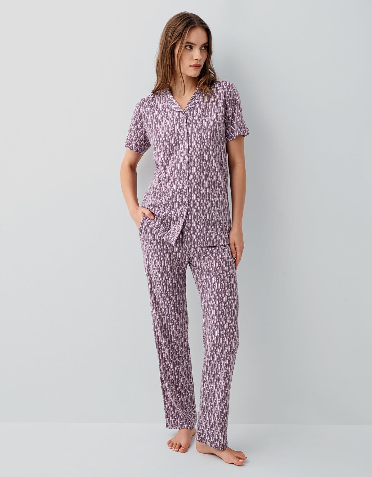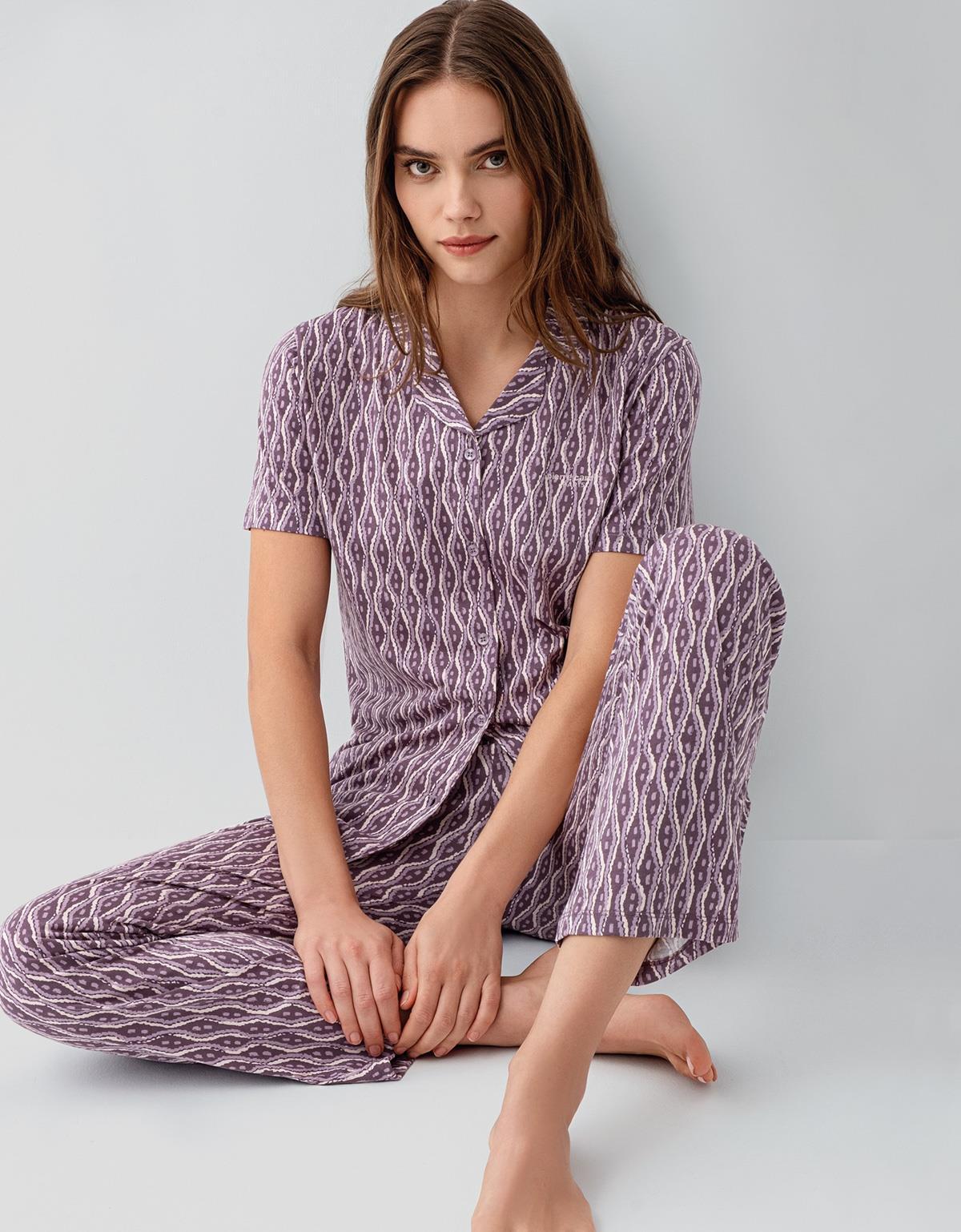 Pierre Cardin Kadın %50 Pamuk %50 Modal Kutulu Gömlek Pijama Takımı – Düğmeli Kısa Kollu Üst ve Desenli Pijama Alt, Cep Detaylı