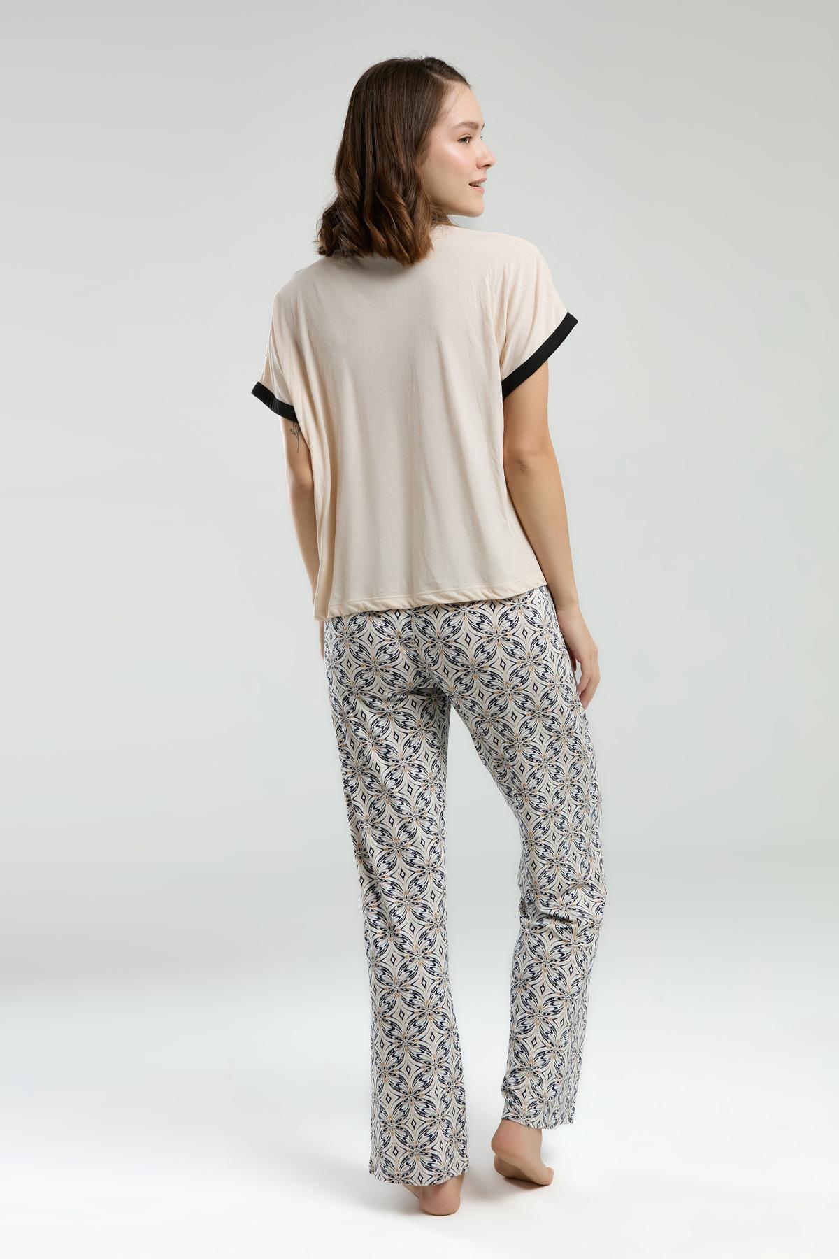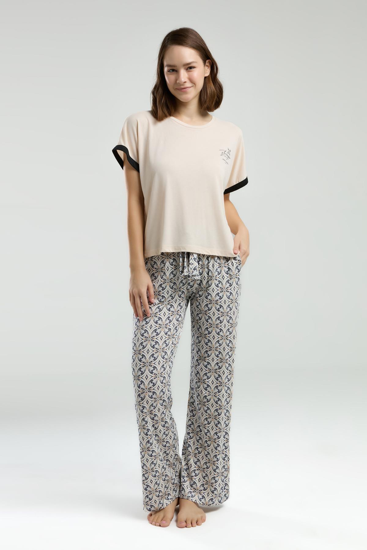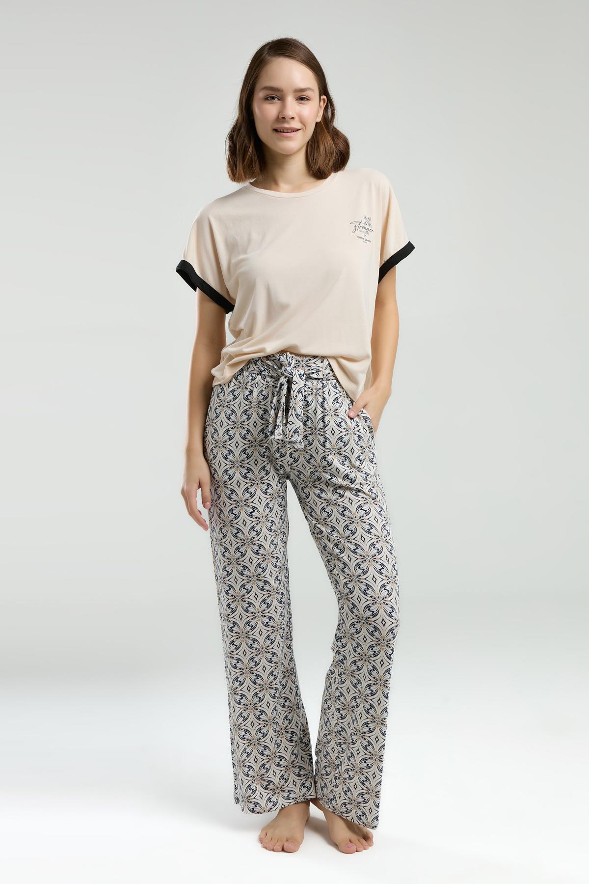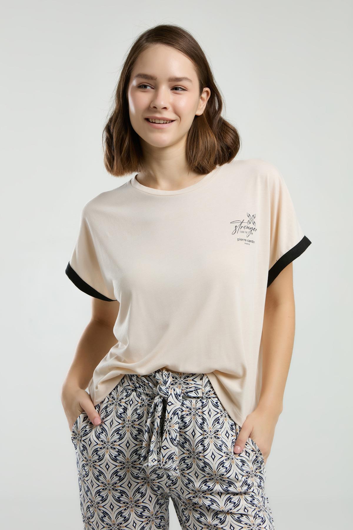Pierre Cardin Kadın Açık Bej Pijama Takım, Kısakol, Yuvarlak Yaka, Cep Detaylı