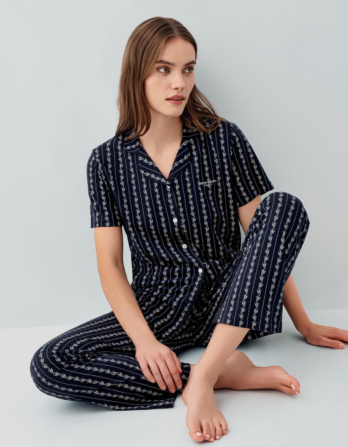 Pierre Cardin Kadın Düğmeli Kısa Kollu Kutulu Pijama Takımı – %50 Pamuk %50 Modal, Çizgili Desen