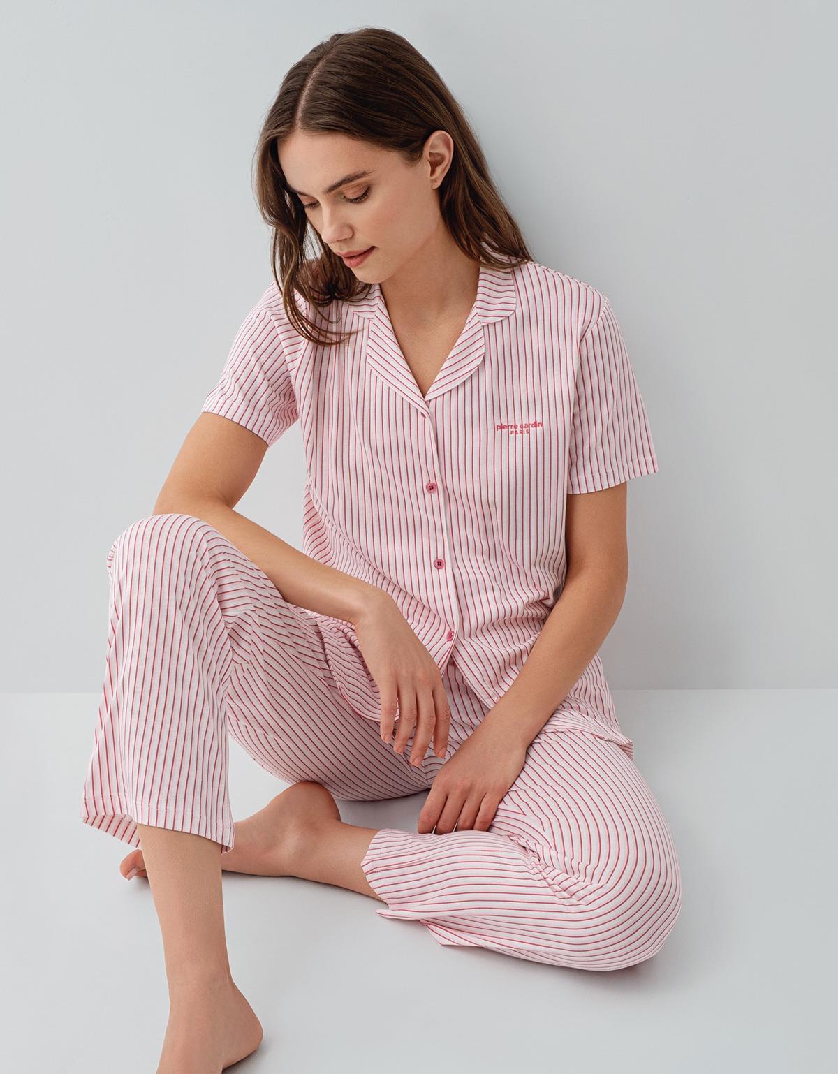 Pierre Cardin Kadın Çizgili Düğmeli Kısa Kollu Kutulu Pijama Takımı – %50 Pamuk %50 Modal, Cep Detaylı