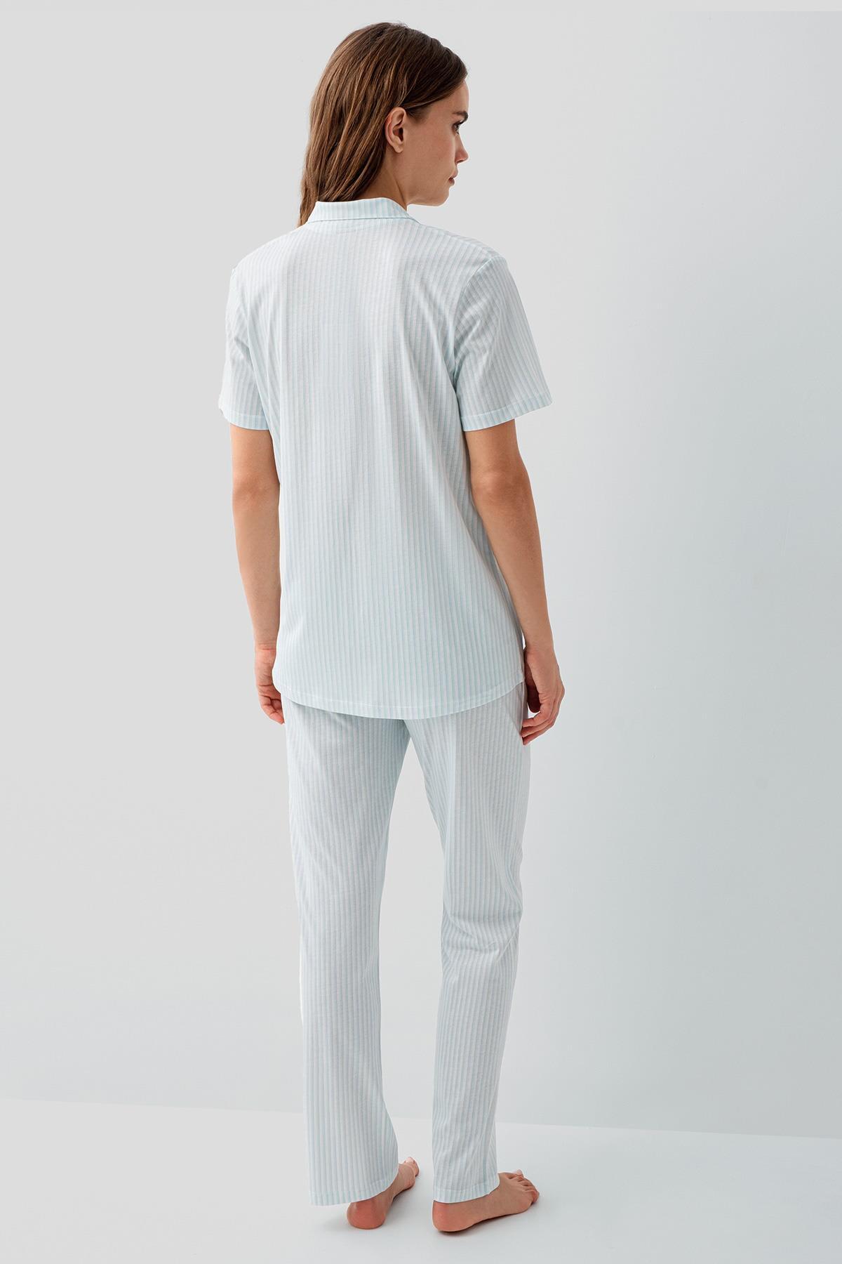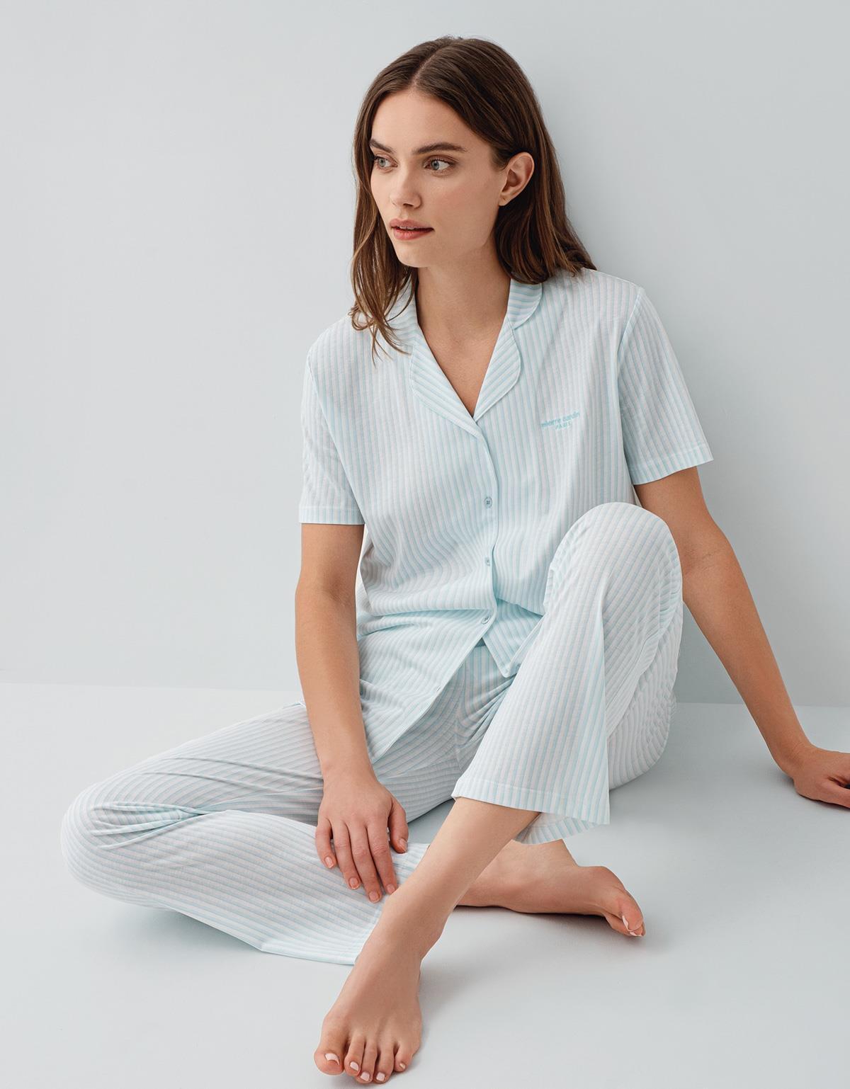 Düğmeli, kısa kollu üst tasarımı ile pratik kullanım sunarken; çizgili deseni pijama takımına modern ve zarif bir görünüm kazandırır. Düz paça alt parçası rahat hareket imkânı sağlar. Hem uyku sırasında hem de ev içinde şık bir alternatif arayanlar için idealdir.