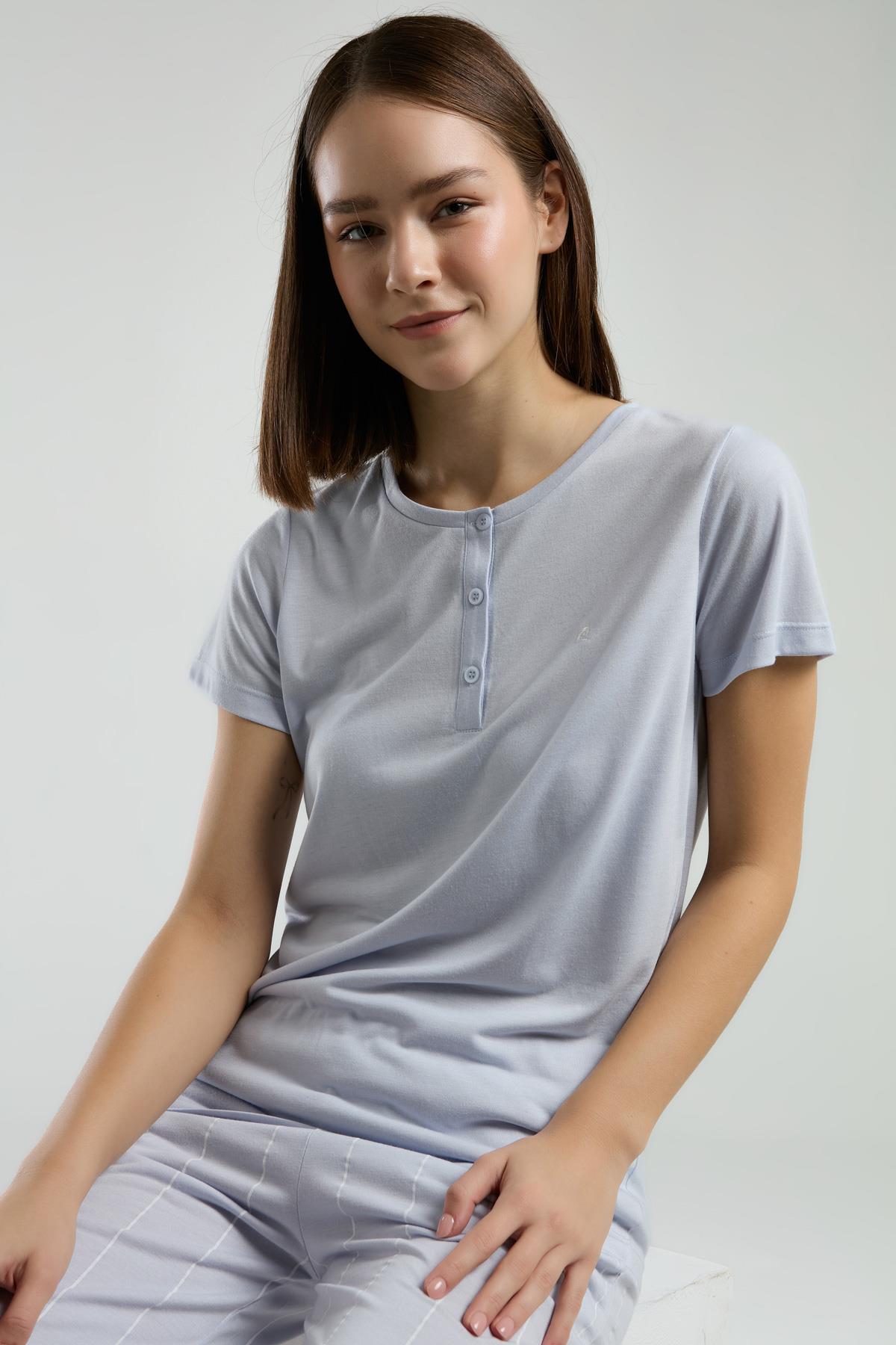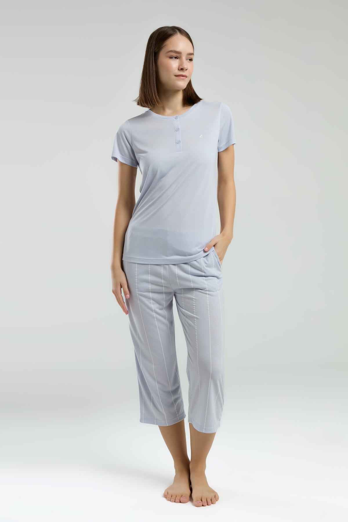 Pierre Cardin Kadın Kapri Takım, Çizgili ve Cepli Kapri, Düğmeli Kısakol T-shirt