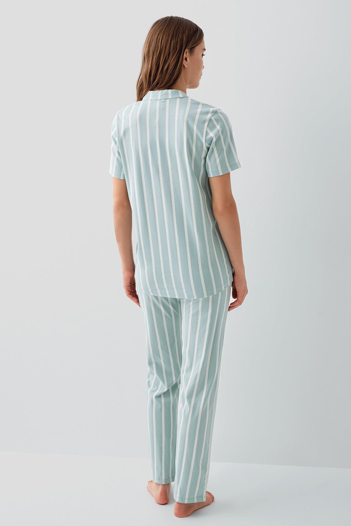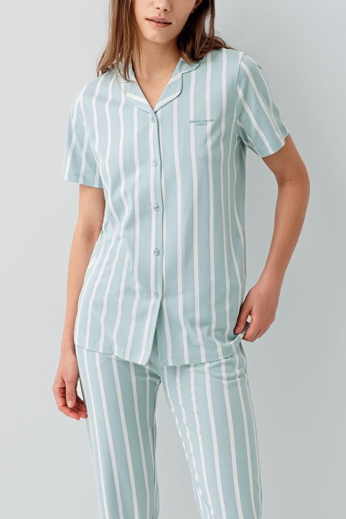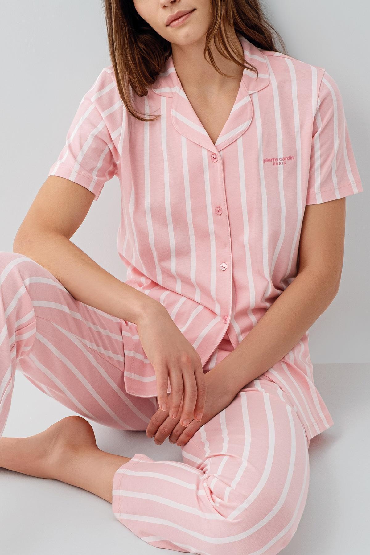 Pierre Cardin Kadın Kısa Kollu Düğmeli Kutulu Pijama Takımı – %50 Modal %50 Pamuk, Çizgili Uzun Alt