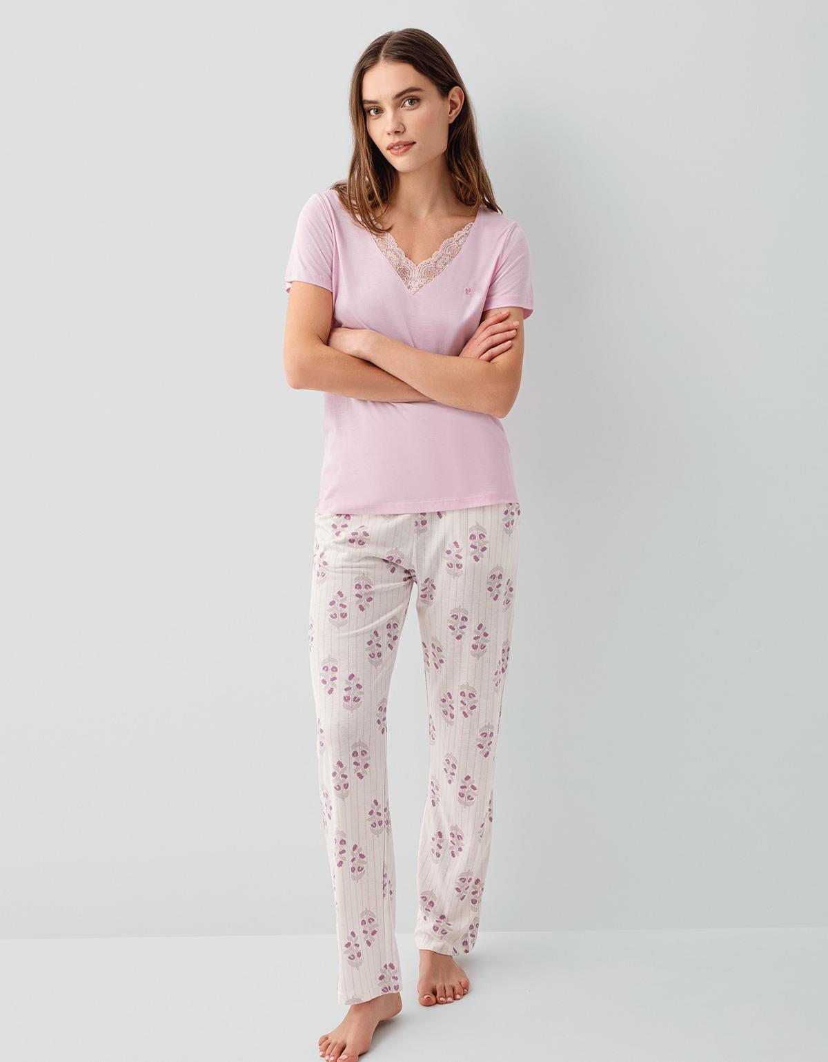 Pierre Cardin Kadın Dantelli Derin V Yaka Pijama Takımı %50 Pamuk %50 Modal – Kısa Kollu, Desenli ve Cepli Alt, Tam Kalıp
