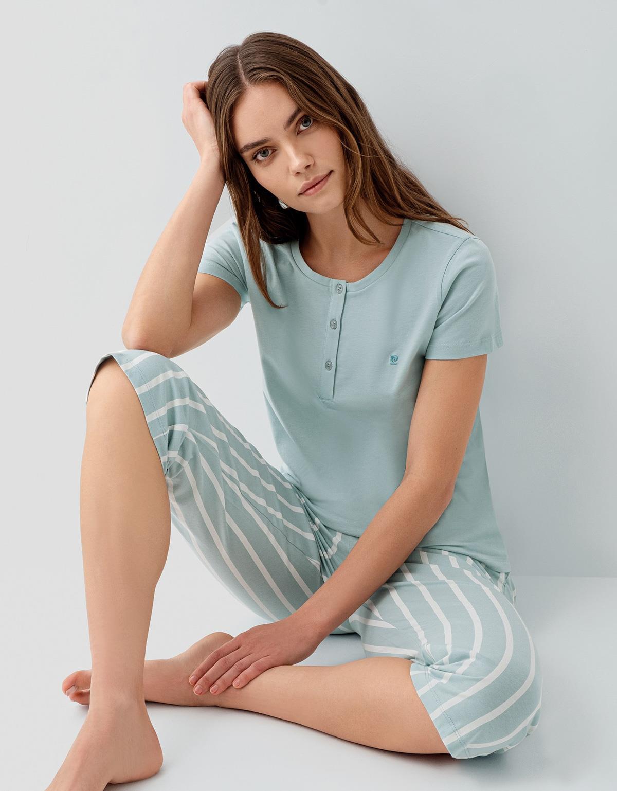 Kadın kısa kollu kapri pijama takımı, %50 modal ve %50 pamuk kumaş karışımıyla gün boyu yumuşaklık ve nefes alabilirlik sunar. Üst parçası kısa kollu, yuvarlak yaka ve düğme detaylıdır. Alt parçası çizgili desenli kapri boy kesime sahiptir.