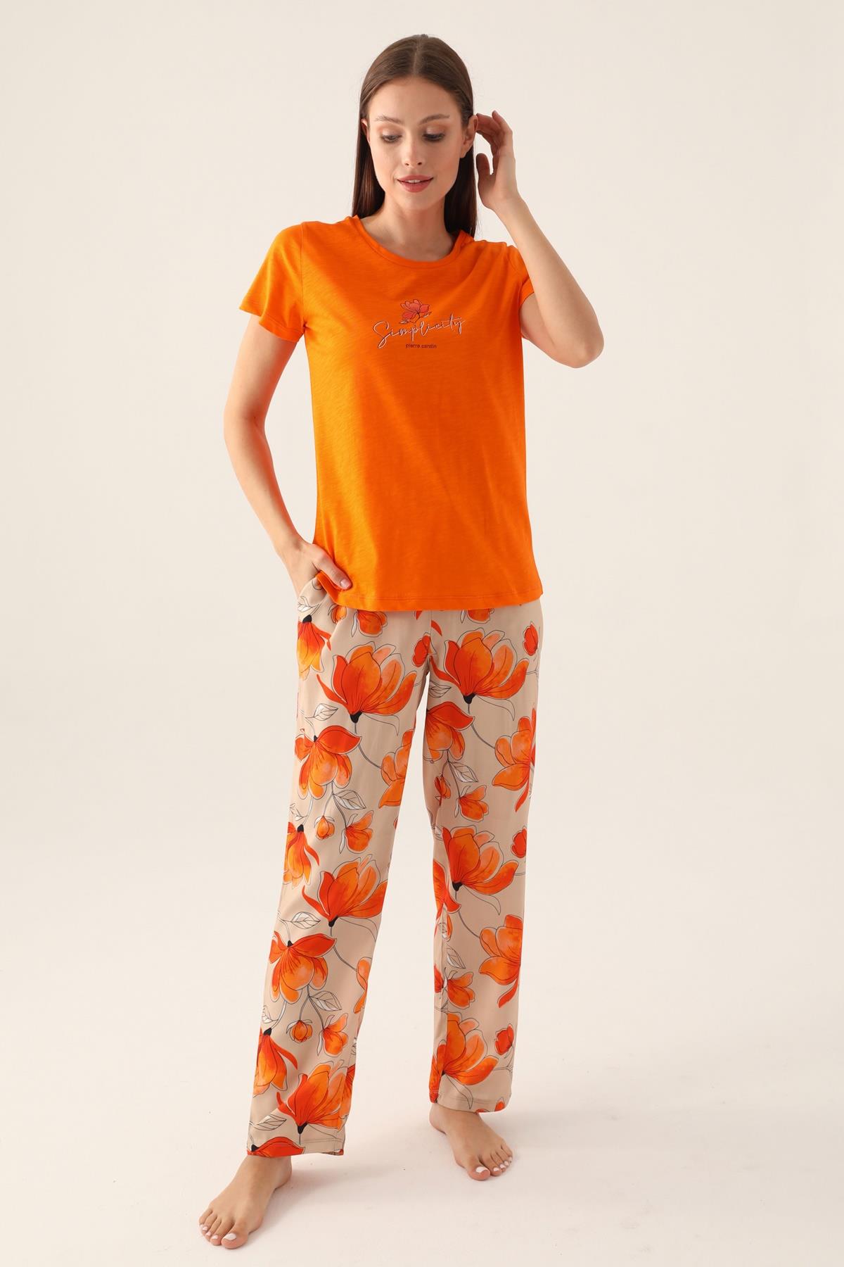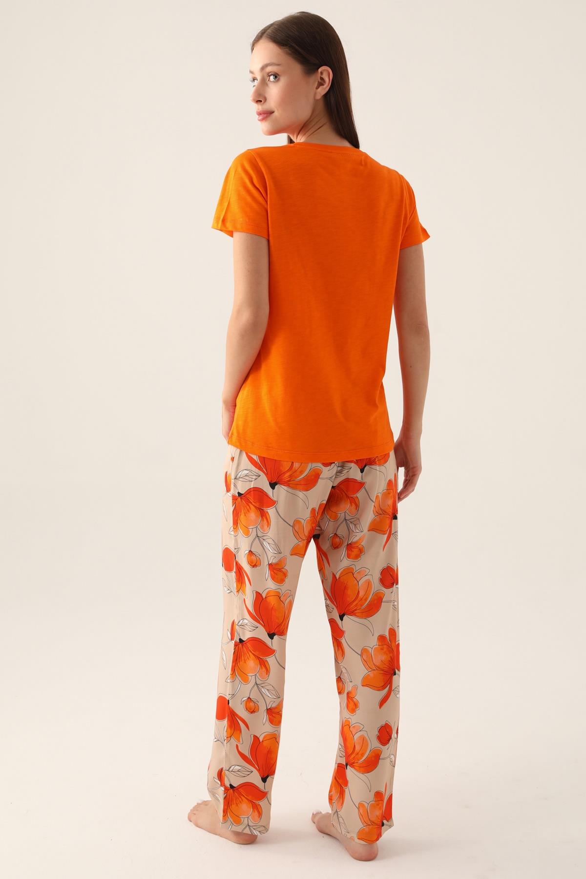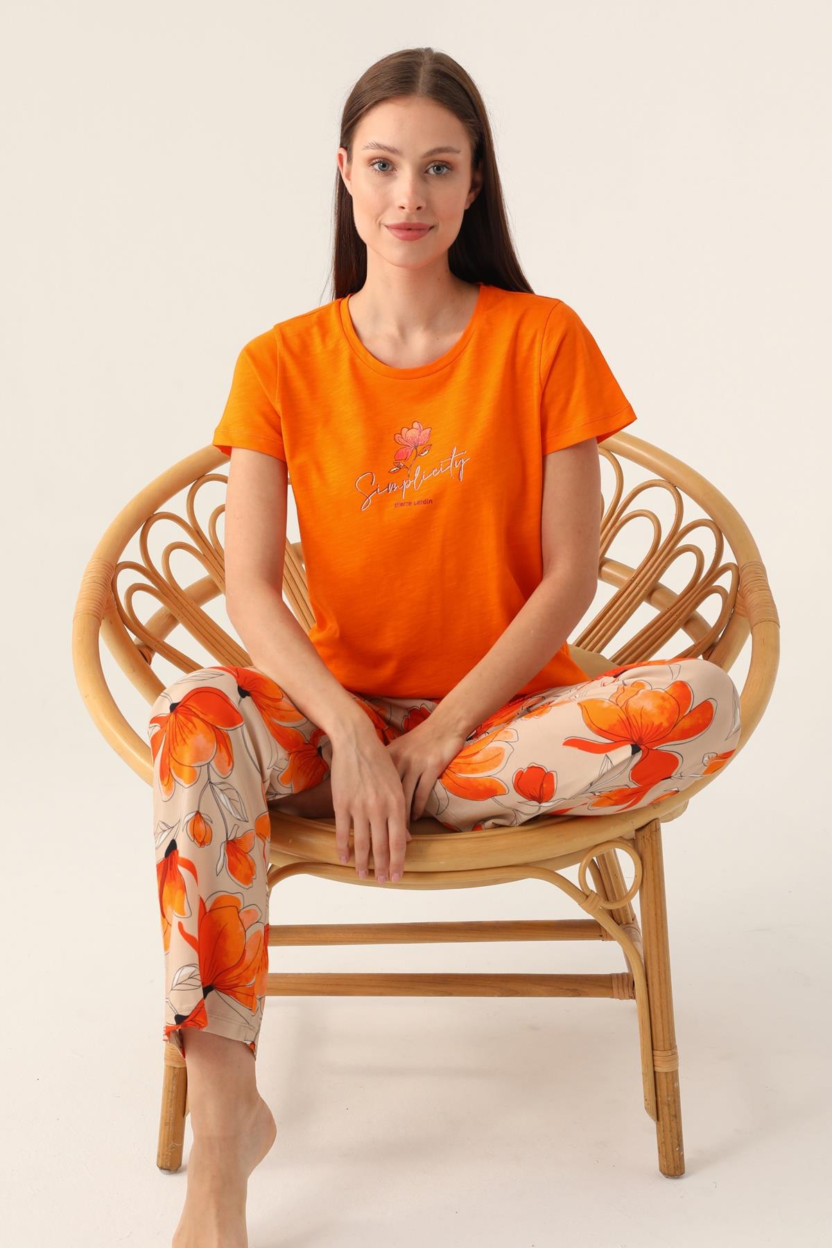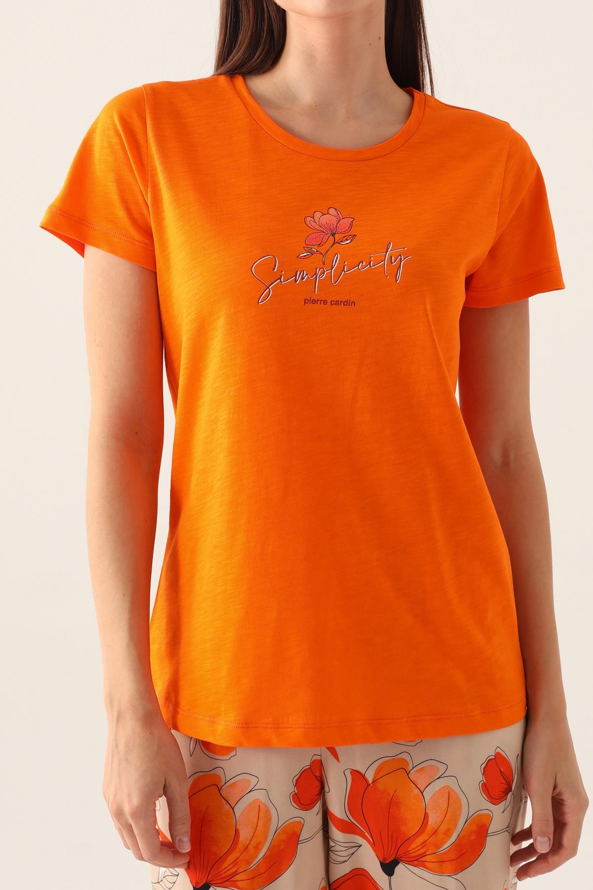Pierre Cardin Kadın Kısakol Turuncu Pijama Takım, Yuvarlak Yaka, Alt Pijama Cepli, %100 Pamuk