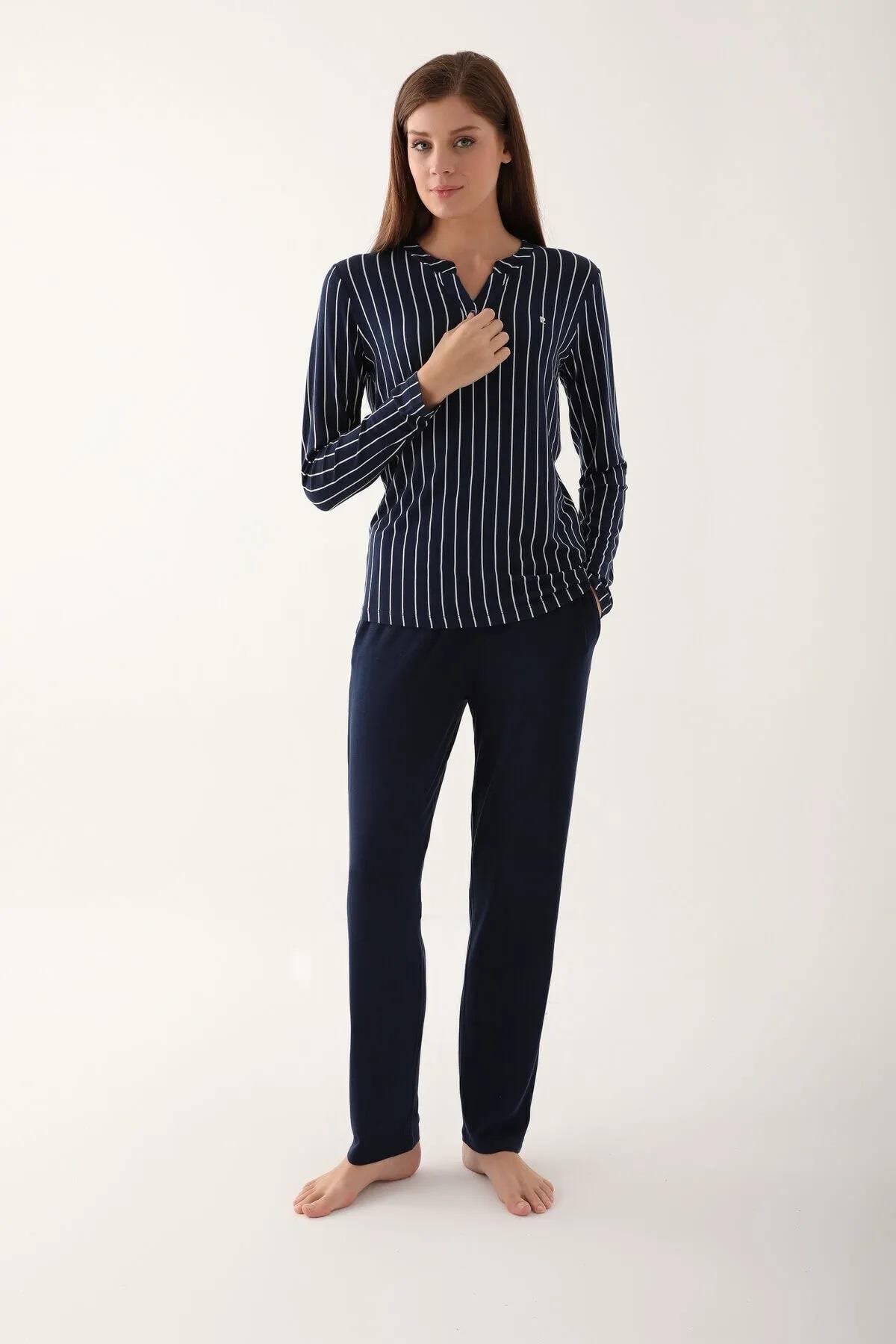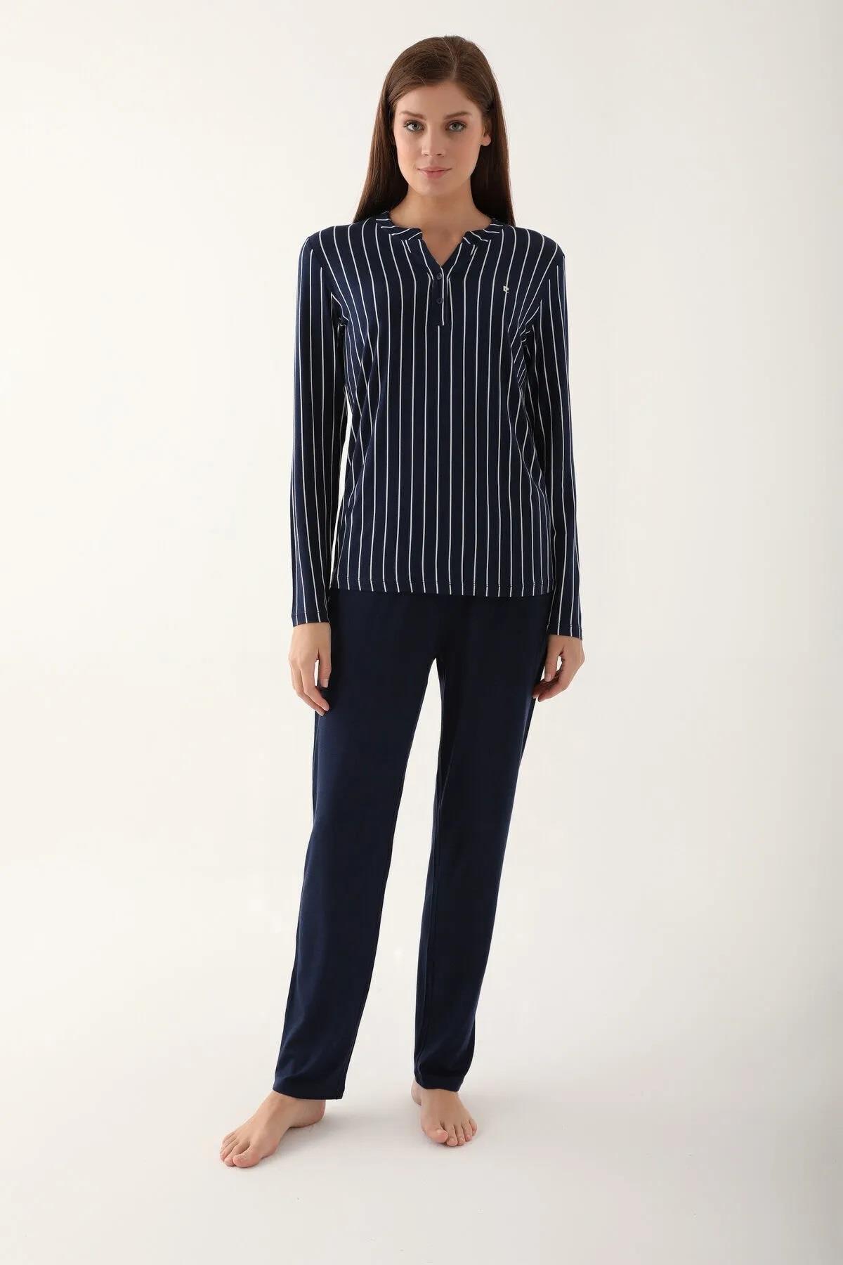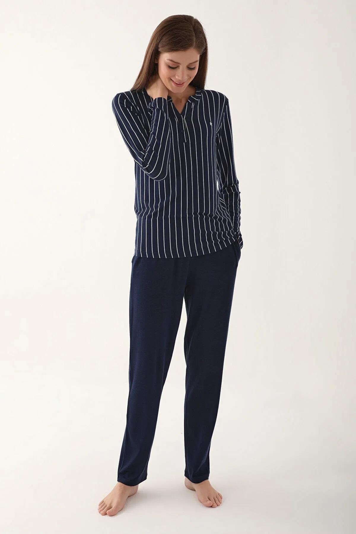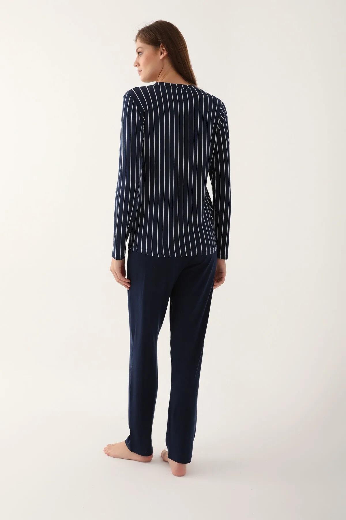 Pierre Cardin Kadın Lacivert Çizgili Pijama Takım, Büyük Beden Kadın Pijama Takım