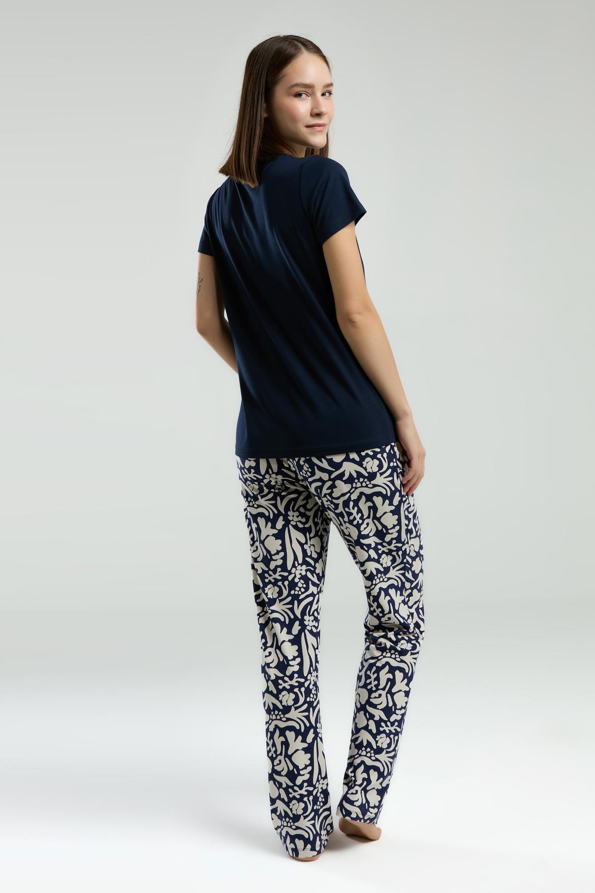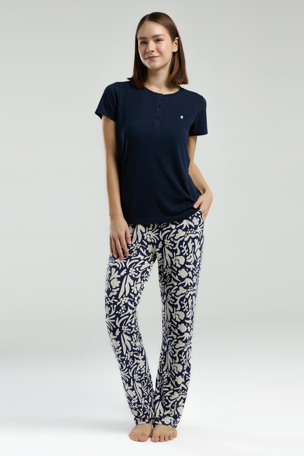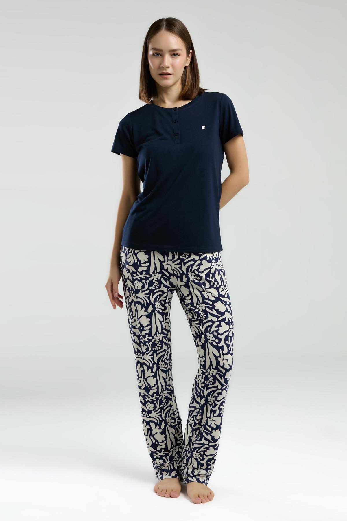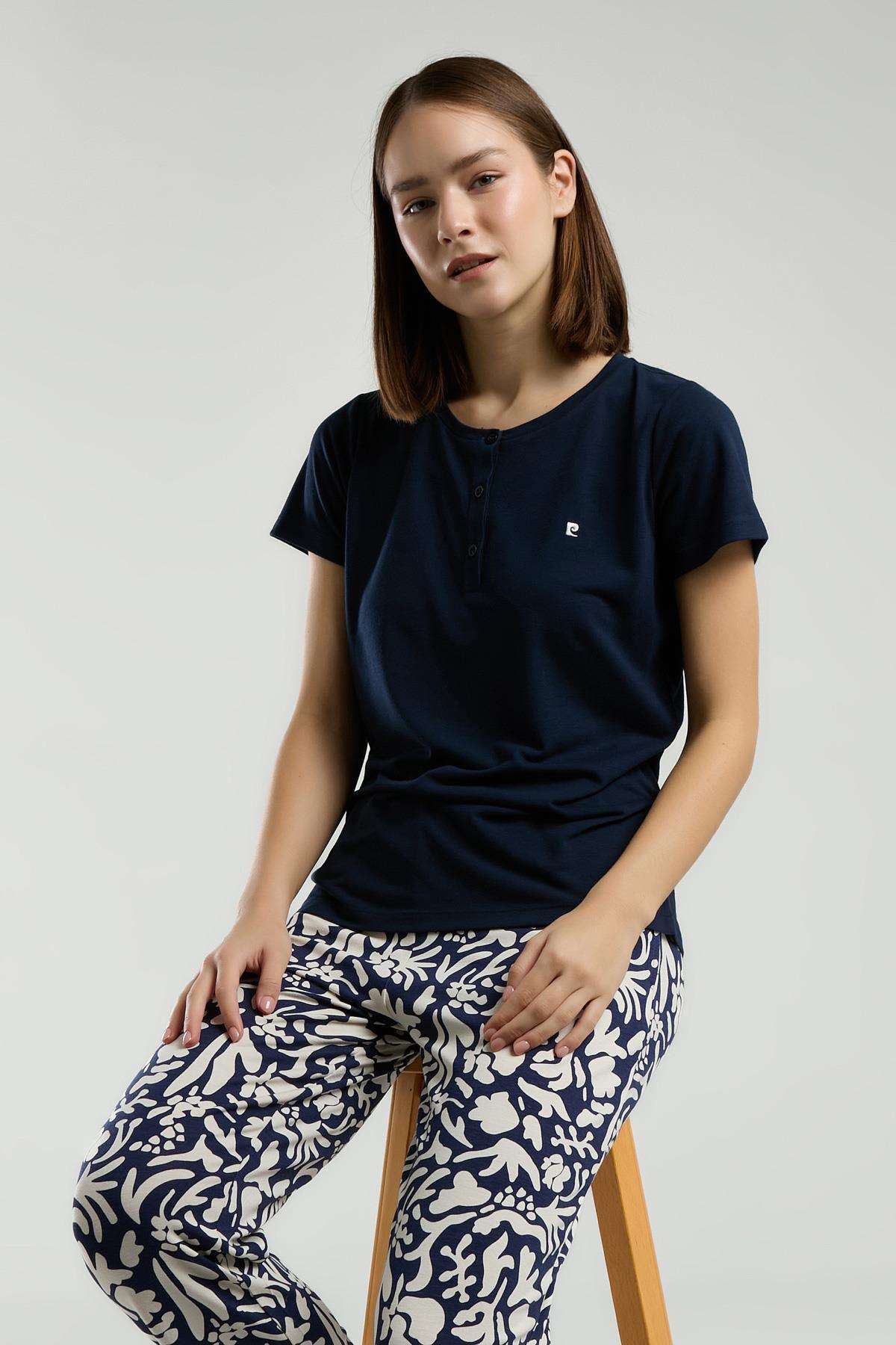 Pierre Cardin Kadın Lacivert Pijama Takım, Kısakol, Yuvarlak Düğmeli Yaka, Cep Detaylı