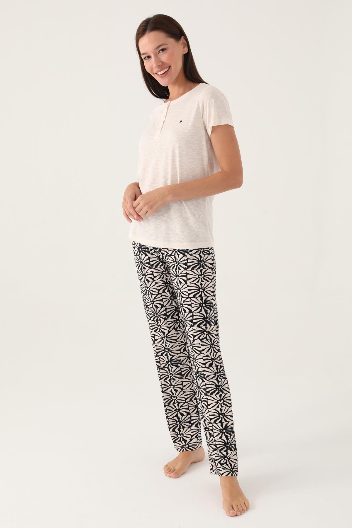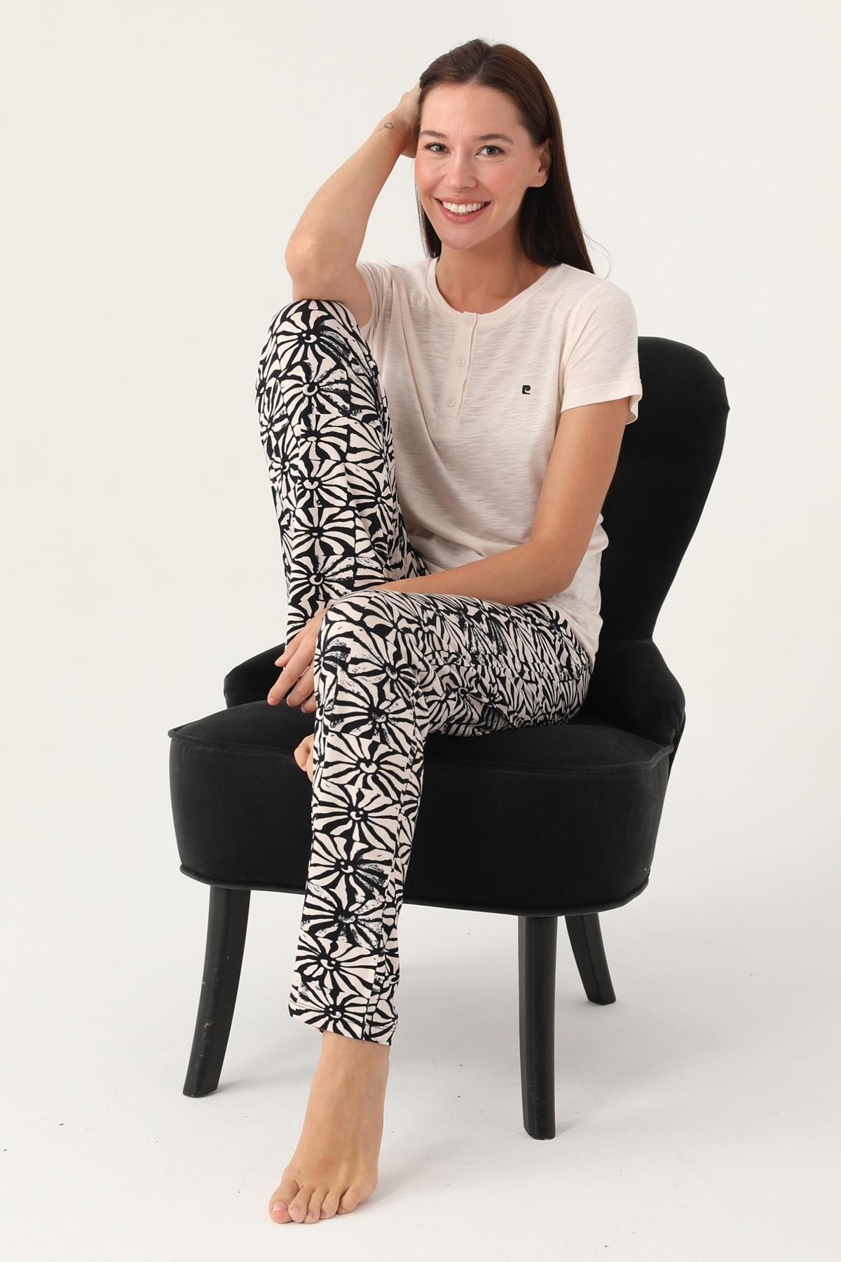 Kadın Kısa Kollu Düğmeli Pijama Takımı – %50 Modal %50 Pamuk-Desenli Rahat Kesim Ev Giyimi