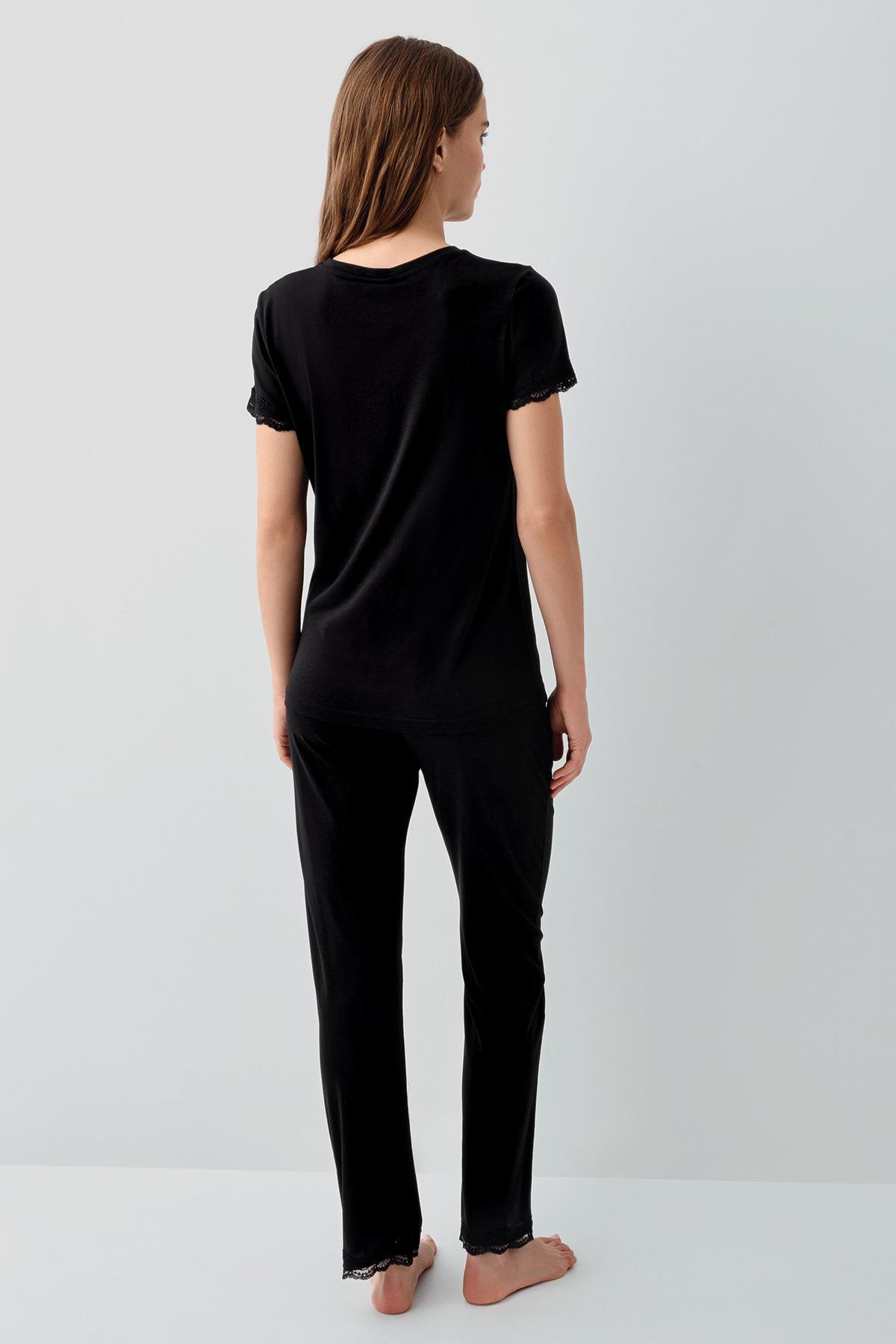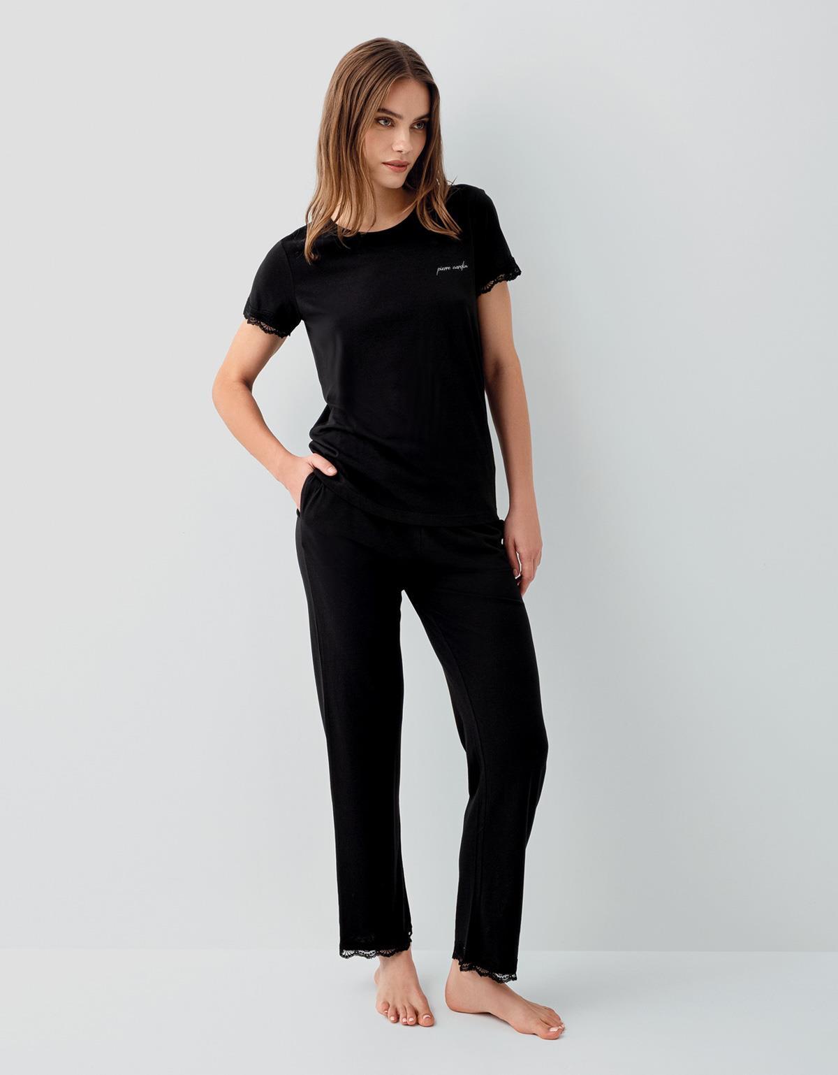 Pierre Cardin Kadın Siyah Dantel Detaylı Pijama Takımı – %50 Pamuk %50 Modal, Kısa Kollu Üst & Cepli Uzun Alt