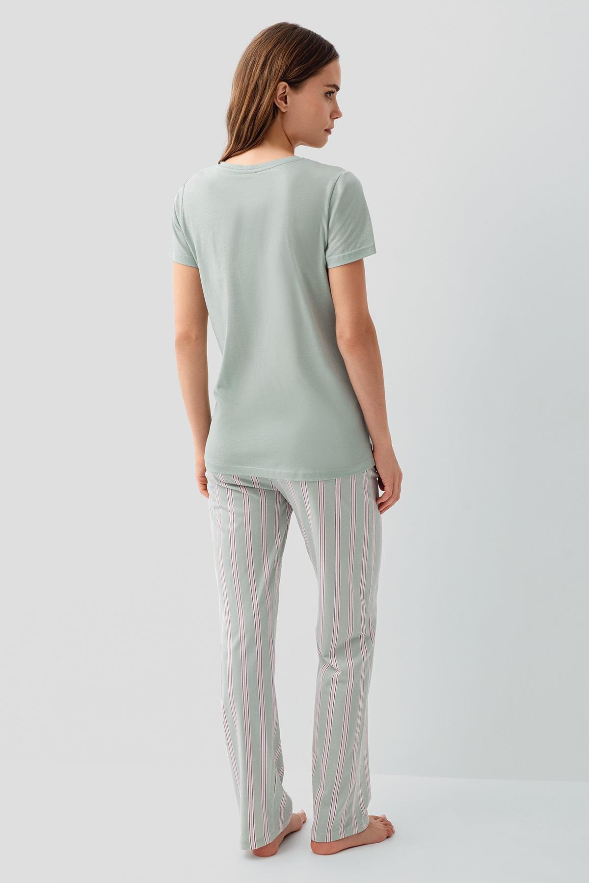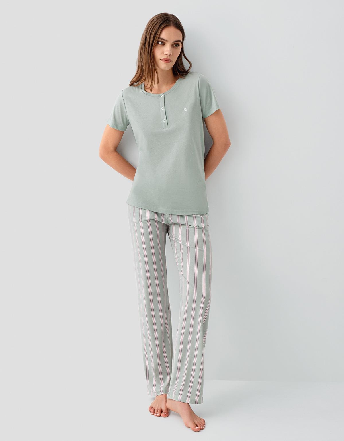 Pierre Cardin Kadın Su Yeşili Kısa Kollu Düğmeli Yaka Pijama Takımı – %50 Pamuk %50 Modal, Cepli Çizgili Alt