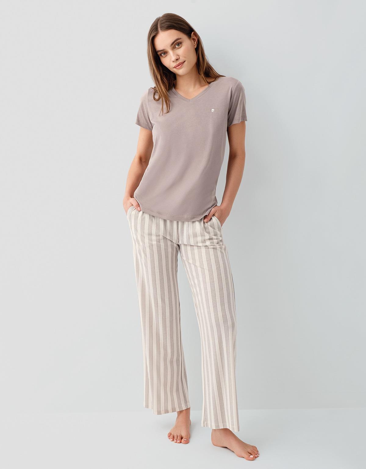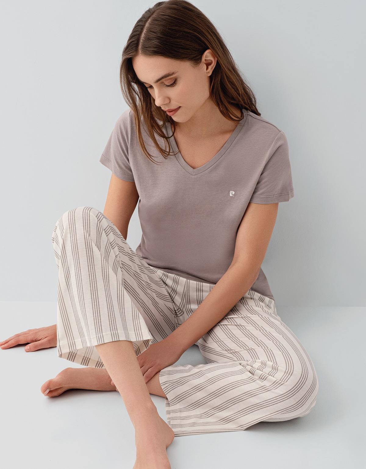 Pierre Cardin Kadın V Yaka Kısa Kollu Pamuk Modal Pijama Takımı – Çizgili Alt Rahat Kesim Ev & Uyku Giyimi , Cep Detaylı