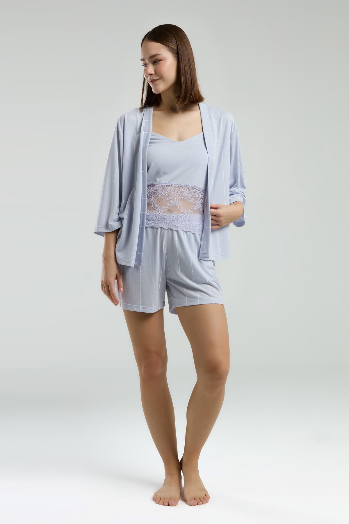 Kadın Mavi Çizgili Kısakol Saten Düğmeli Gömlek Pijama Takım