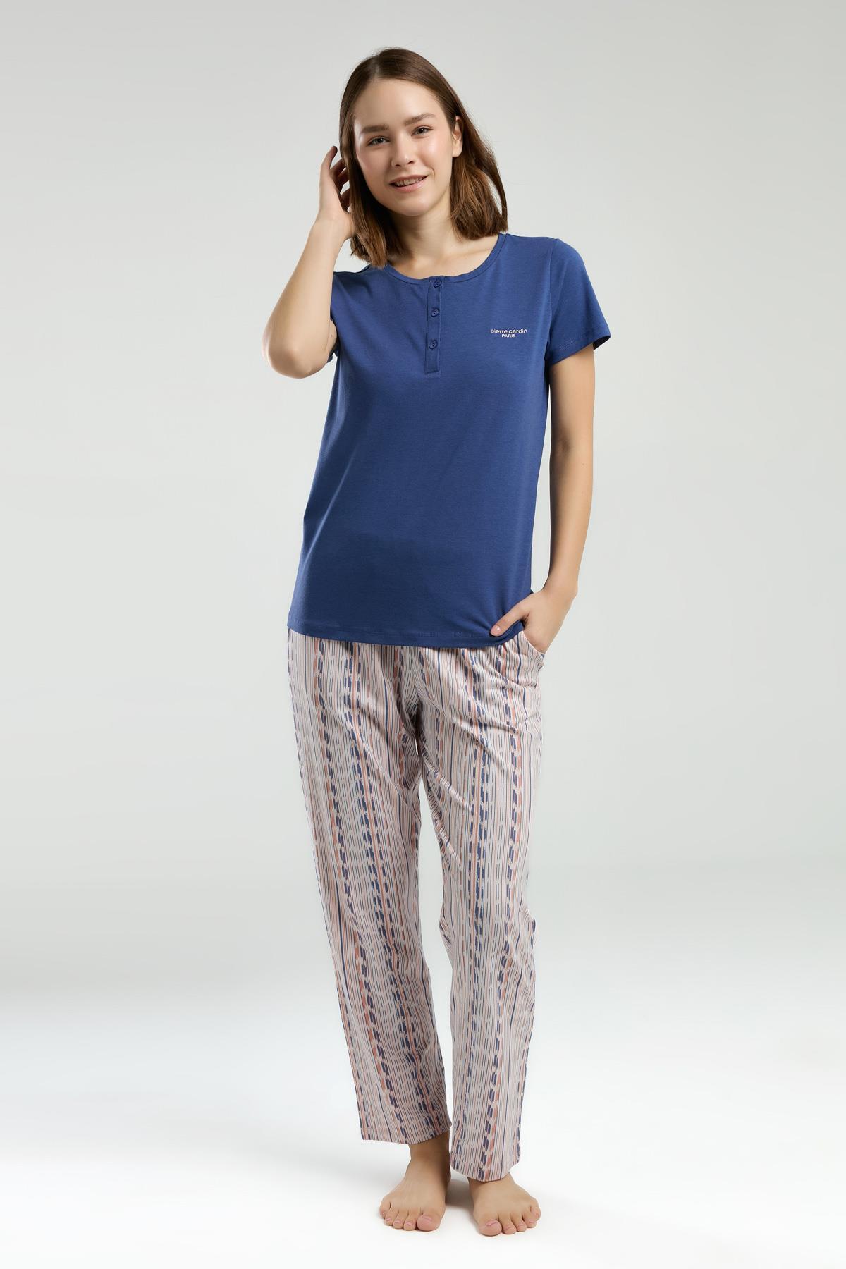 Pierre Cardin Modal Pamuk Düğmeli Yaka Kısakol Cepli Kadın Pijama Takım KOYU İNDİGO