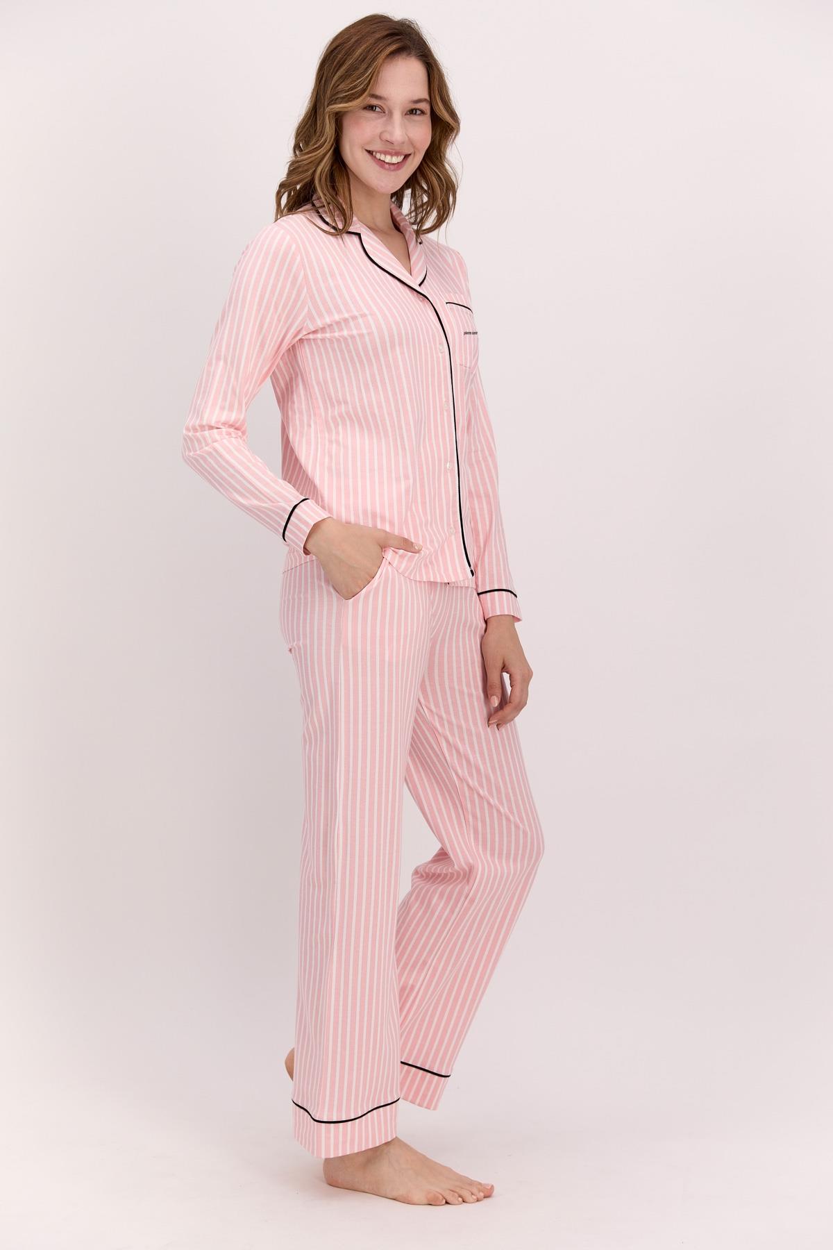 Pierre Cardin Pembe Kadın Pijama Takım, Beyaz Çizgili Pijama Takım, Mevsimlik Uzunkol Gömlek Pijama Takım
