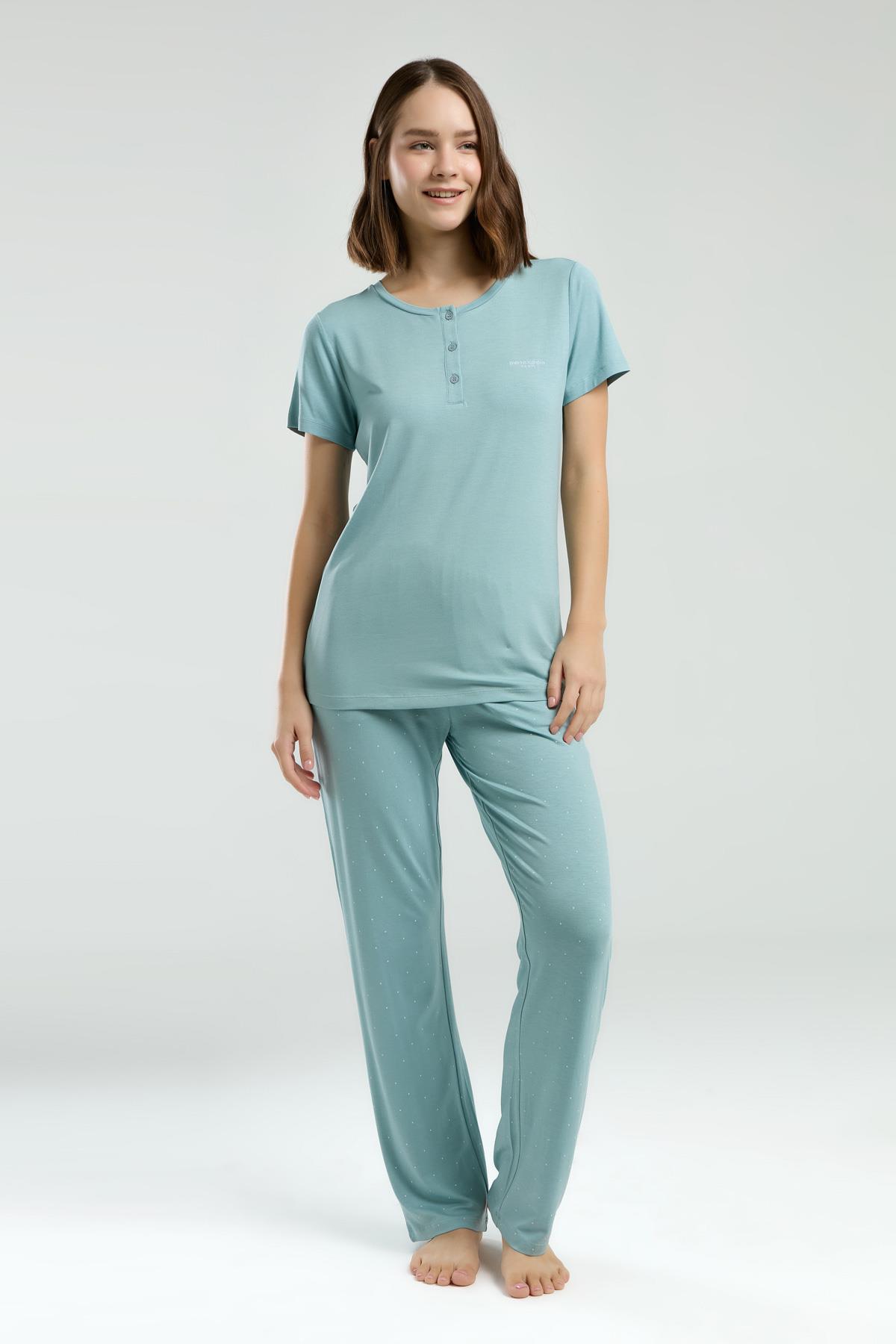 Pierre Cardin Su Yeşili Düğmeli Yaka Kısakol Pijama Takım, Cep Detaylı, Viskon Kumaş