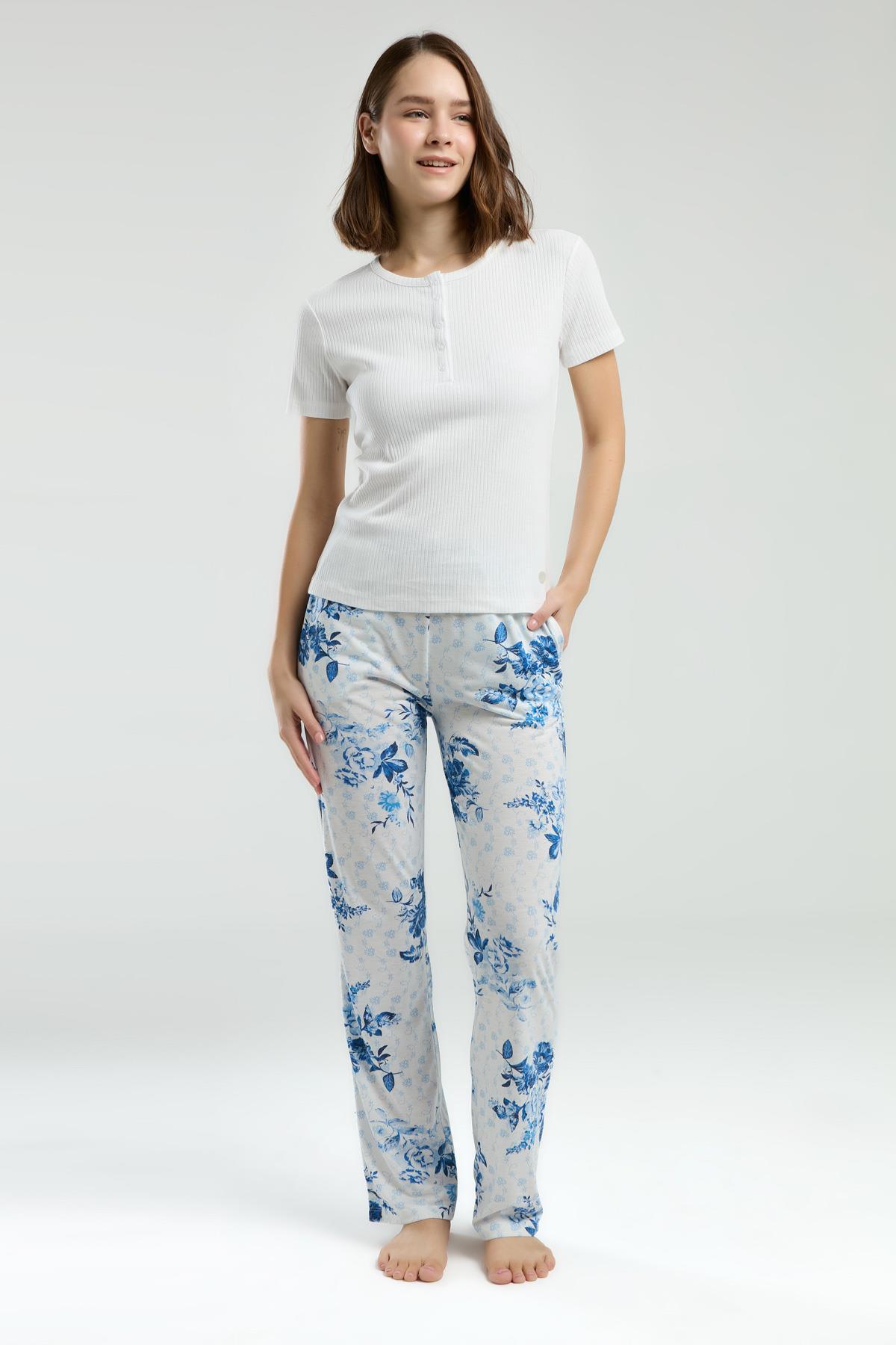 Kadın %50 Pamuk %50 Modal Düğmeli Pijama Takımı – Kısa Kollu, Uzun Paça, Yumuşak Dokulu Ev Giyimi