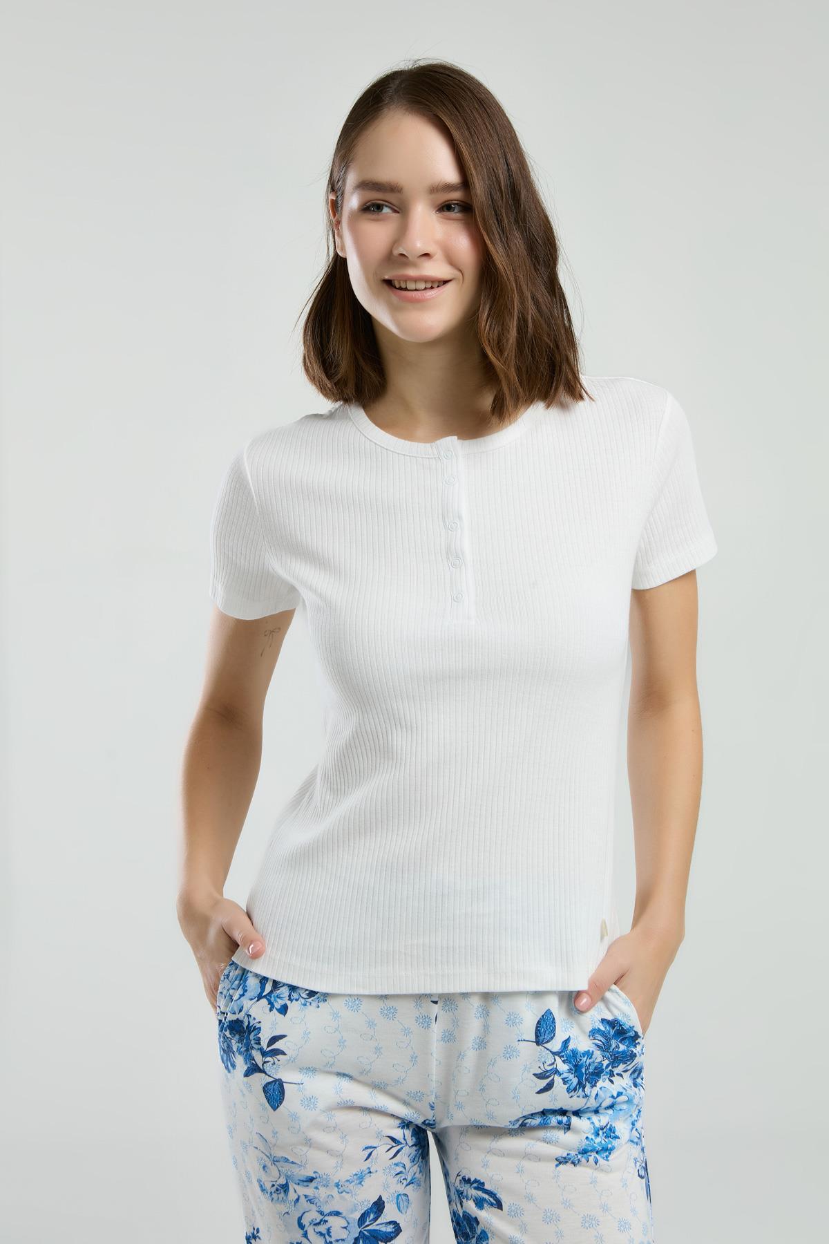 Kadın Kısa Kollu Düğmeli Pijama Takımı – %50 Modal %50 Pamuk-Desenli Rahat Kesim Ev Giyimi