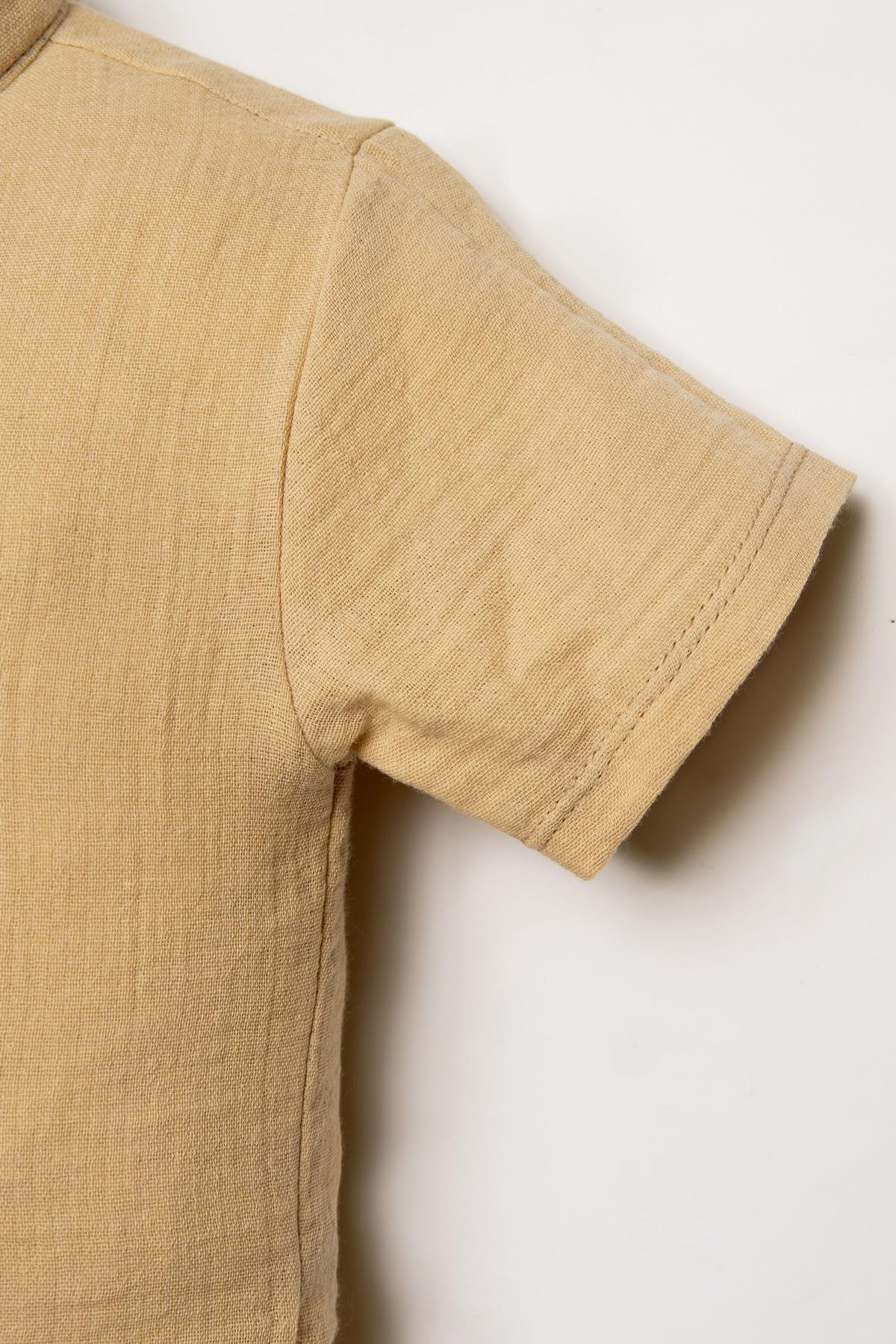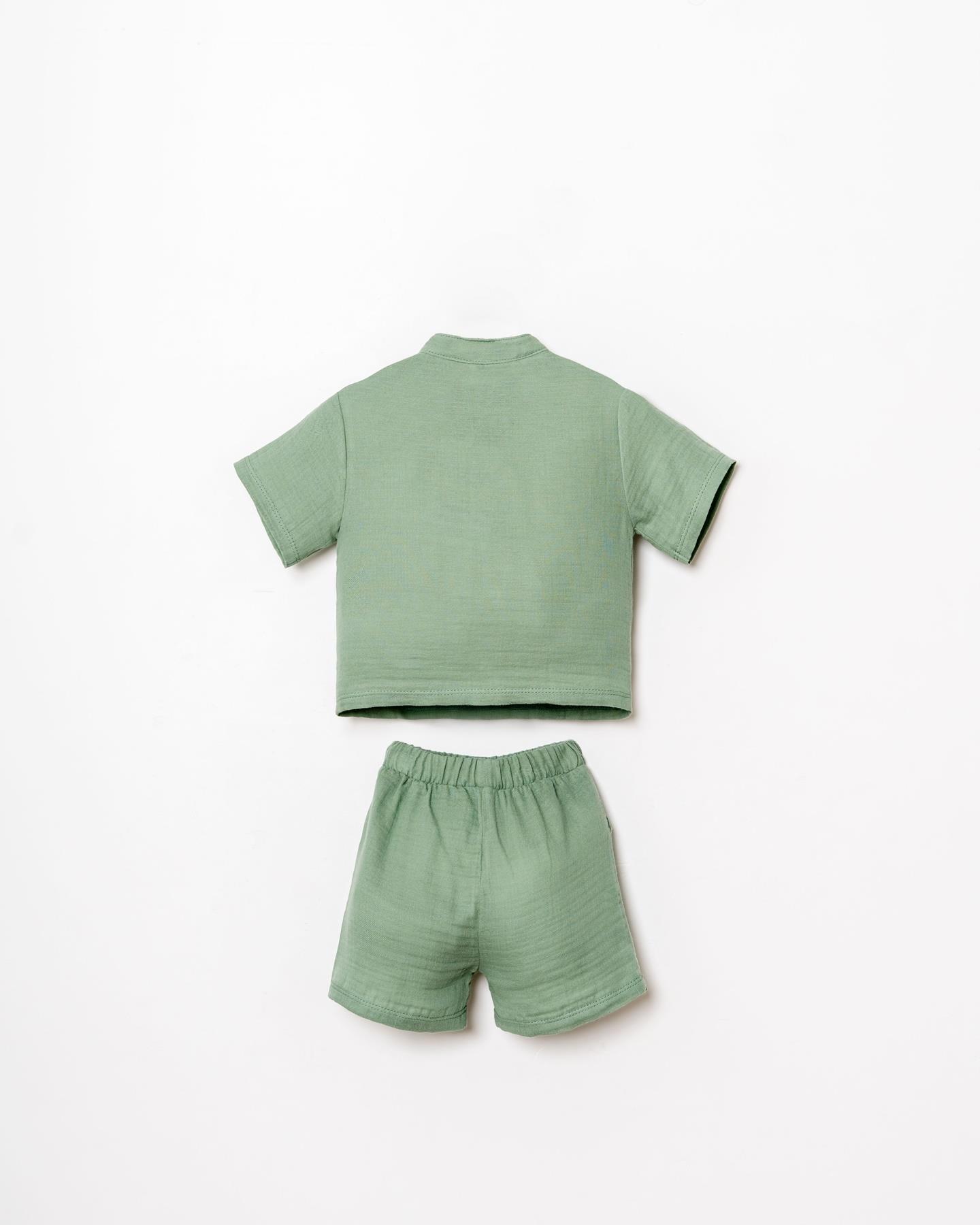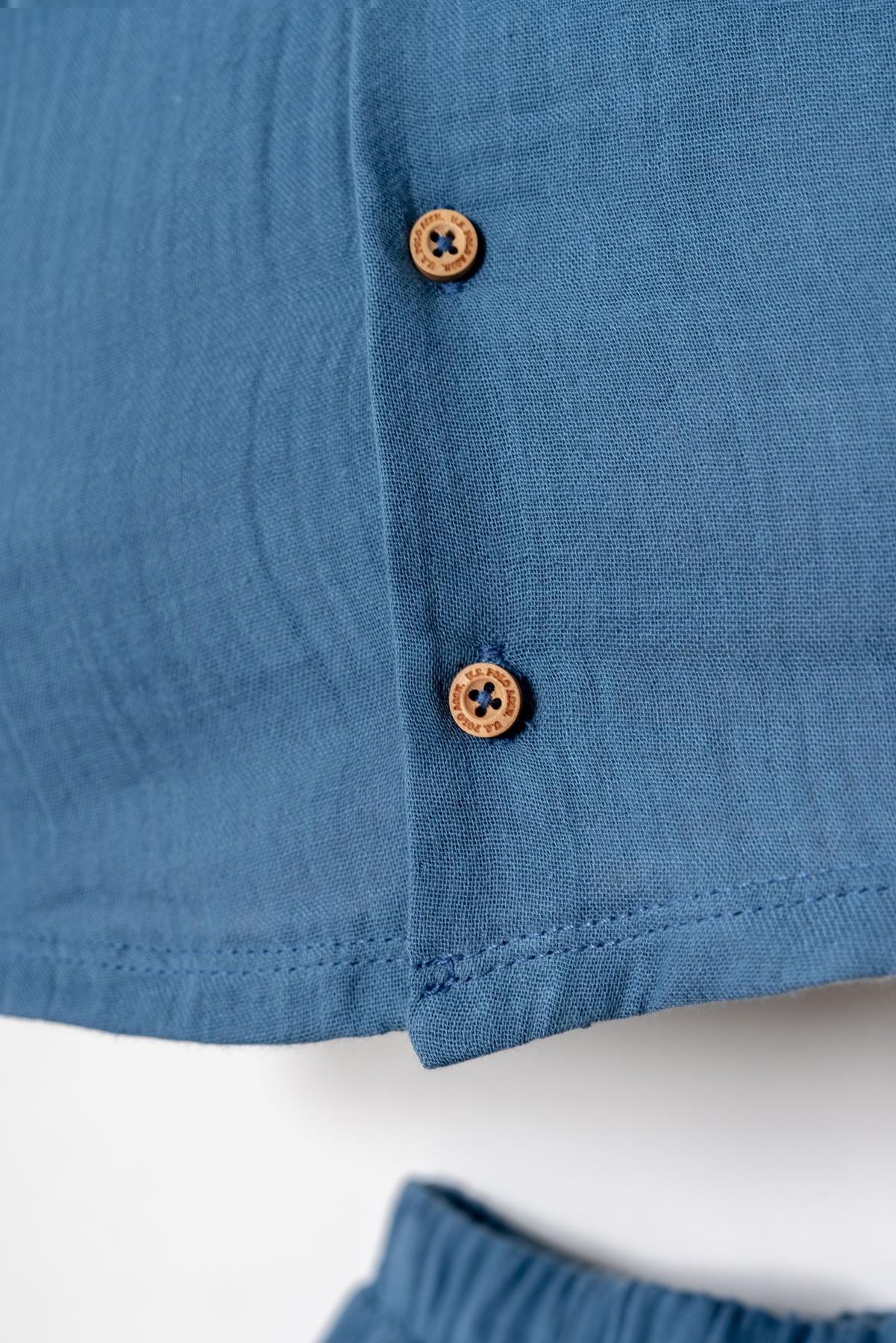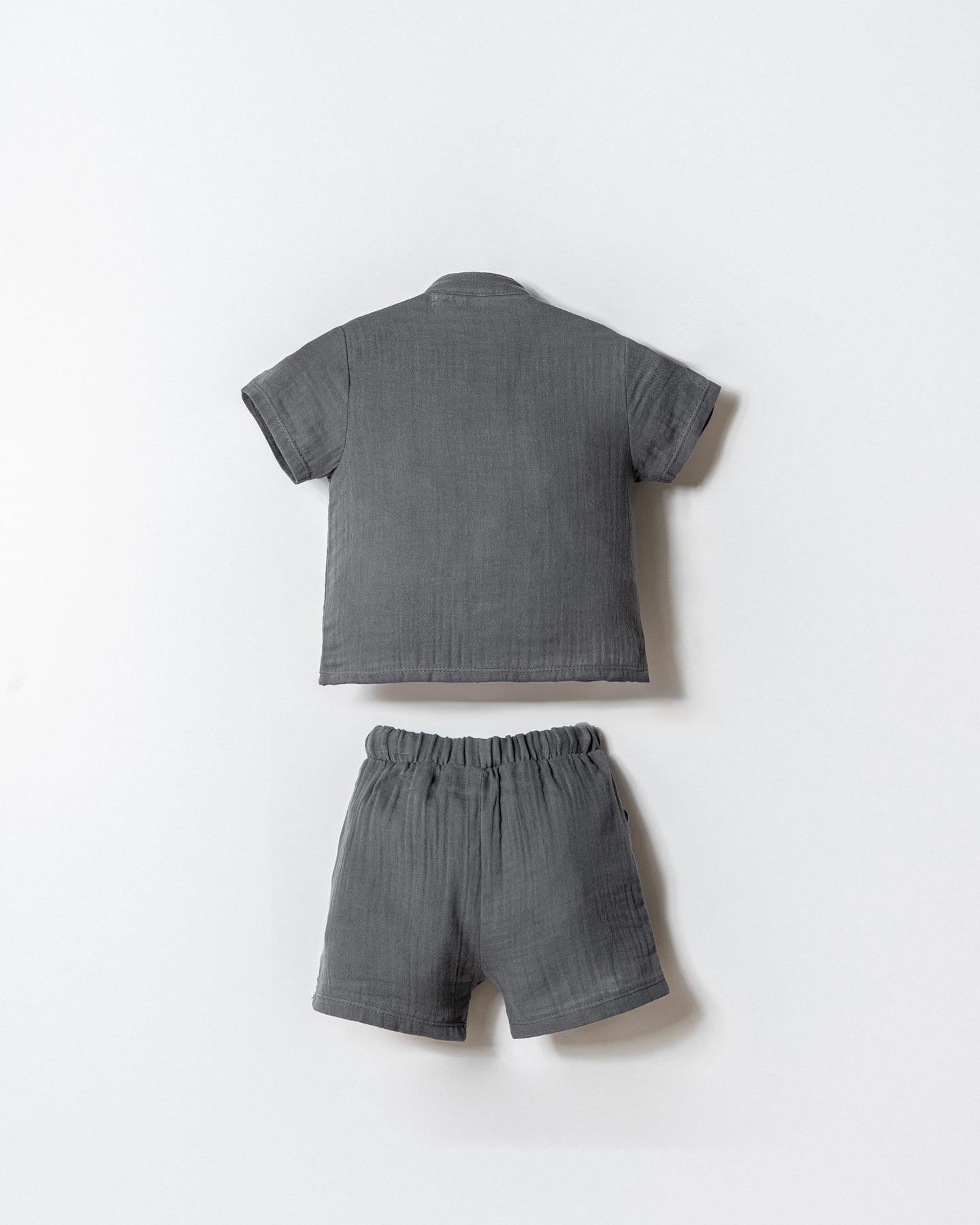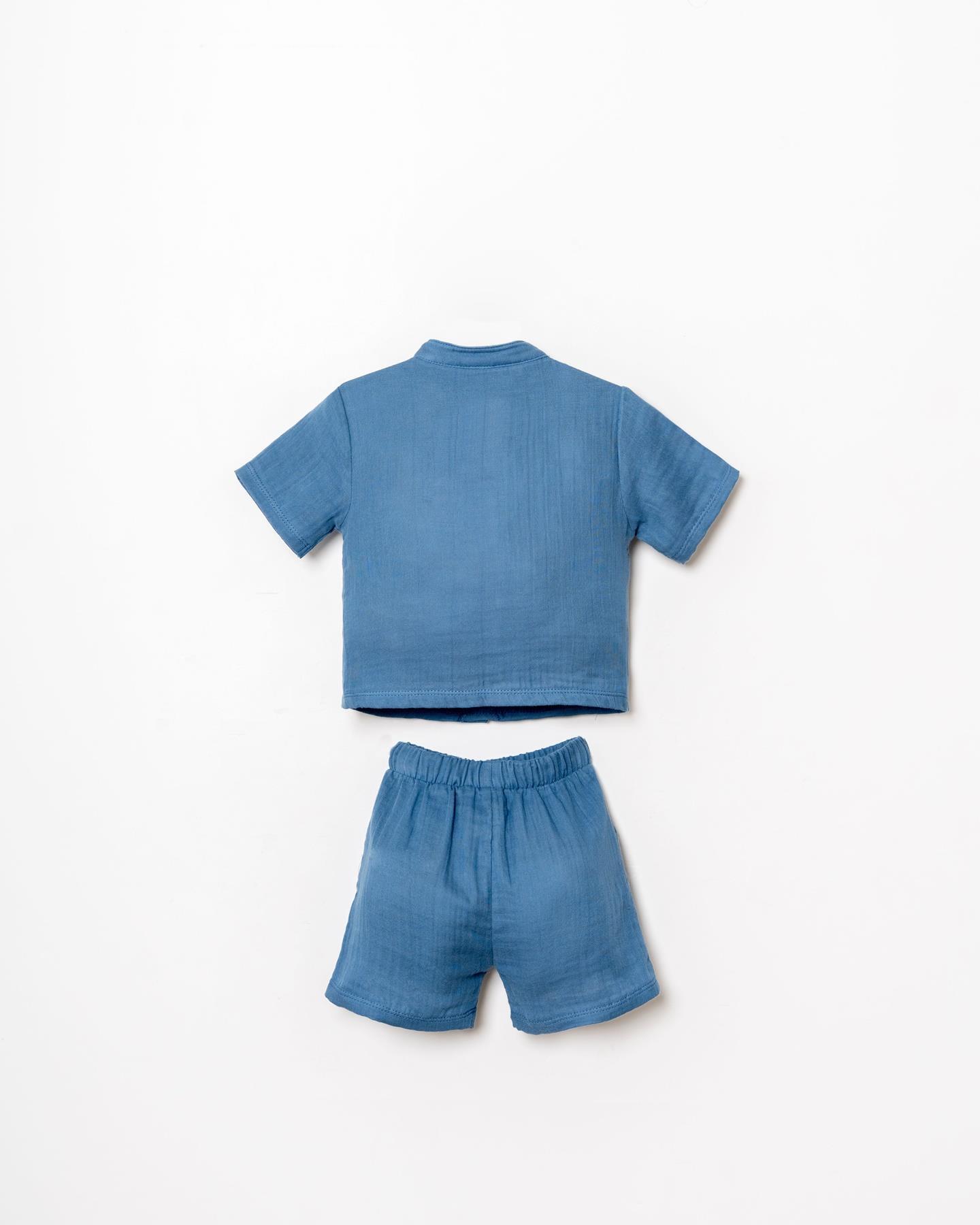 Şık hakim yaka düğmeli gömlek tasarımı ve rahat kalıplı şortu ile hem günlük kullanımda hem de özel gün kombinlerinde zarif bir görünüm sunar. Doğal dokusu sayesinde hassas bebek cildi için uygundur.
