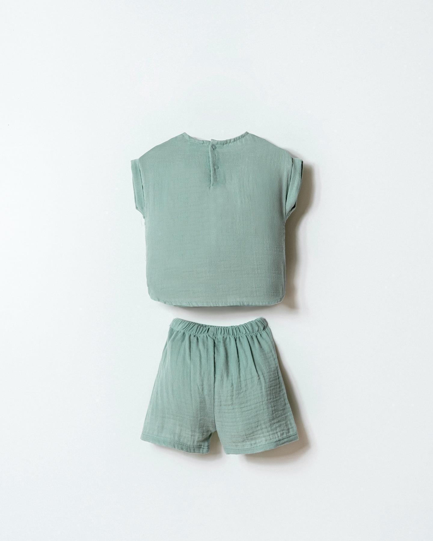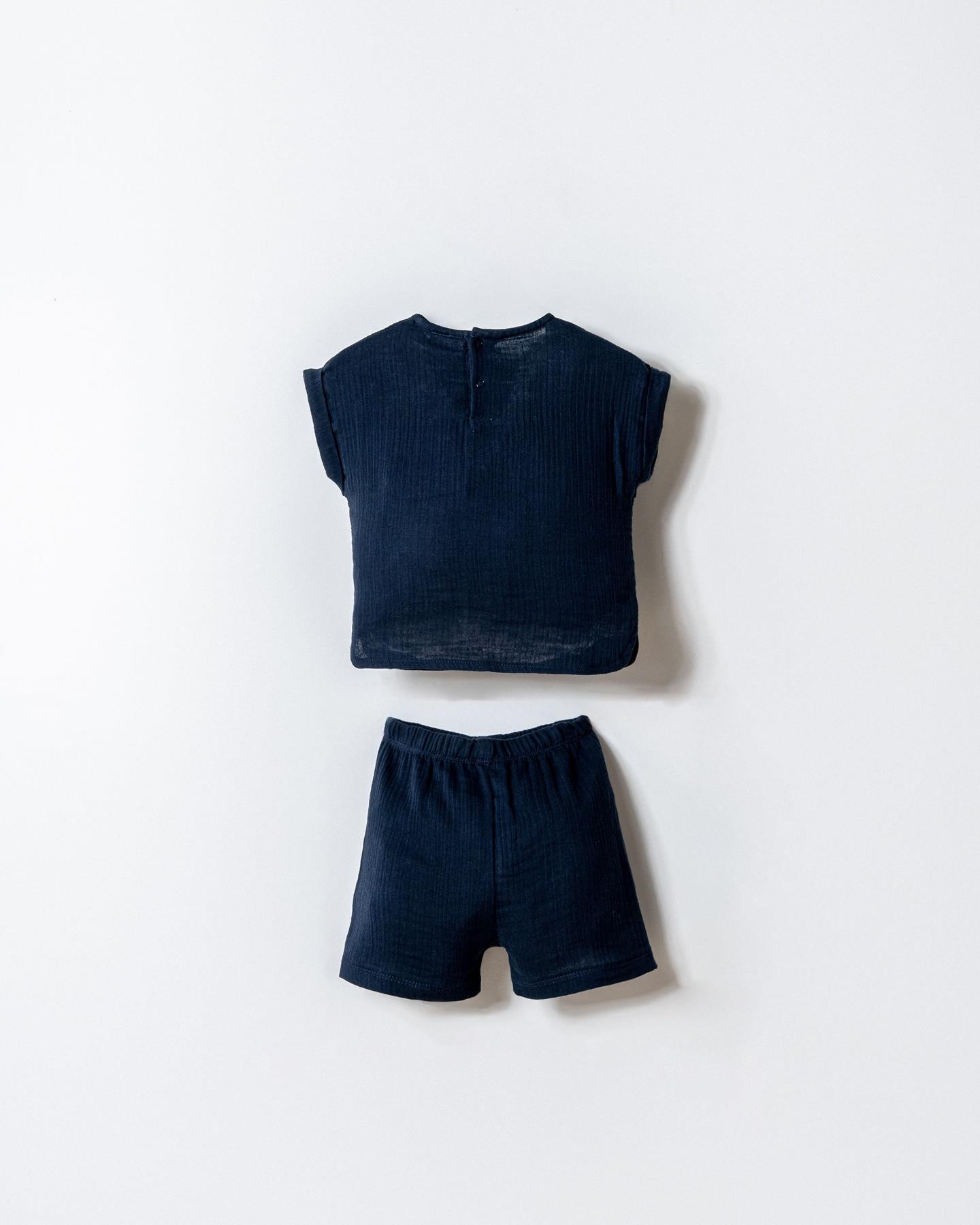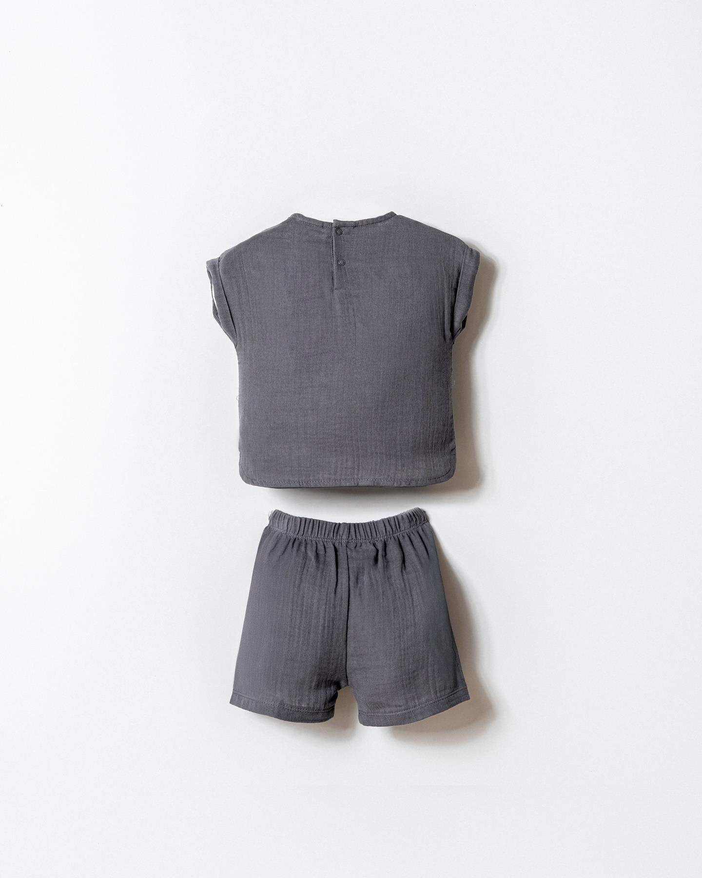 Modern kesimi, düğme detaylı gömlek tasarımı ve minimal logo nakışı ile hem günlük kullanım hem özel gün kombinleri için şık bir alternatiftir. Esnek bel yapısına sahip şortu sayesinde bebeğiniz gün boyu rahat hareket eder.