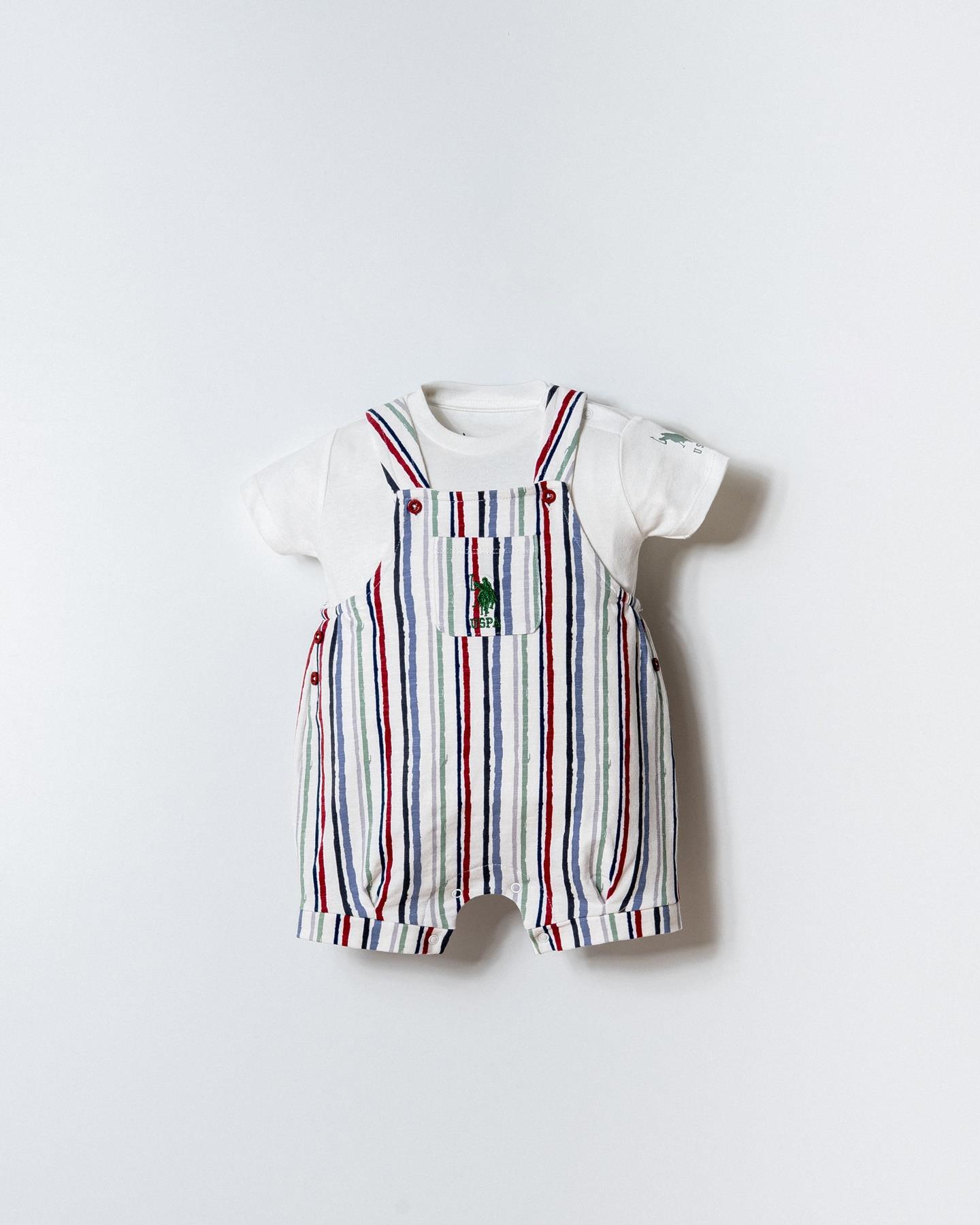%96 pamuk ve %4 elastan içeriğe sahip iki iplik kumaşı yumuşak dokusuyla hassas bebek cildi için uygundur. İç kısmındaki kısa kollu t-shirt ile birlikte kombinlenmiş bu set, pratik giydirme kolaylığı sağlar. Salopetin çıtçıtlı alt kısmı bez değişimini kolaylaştırır.