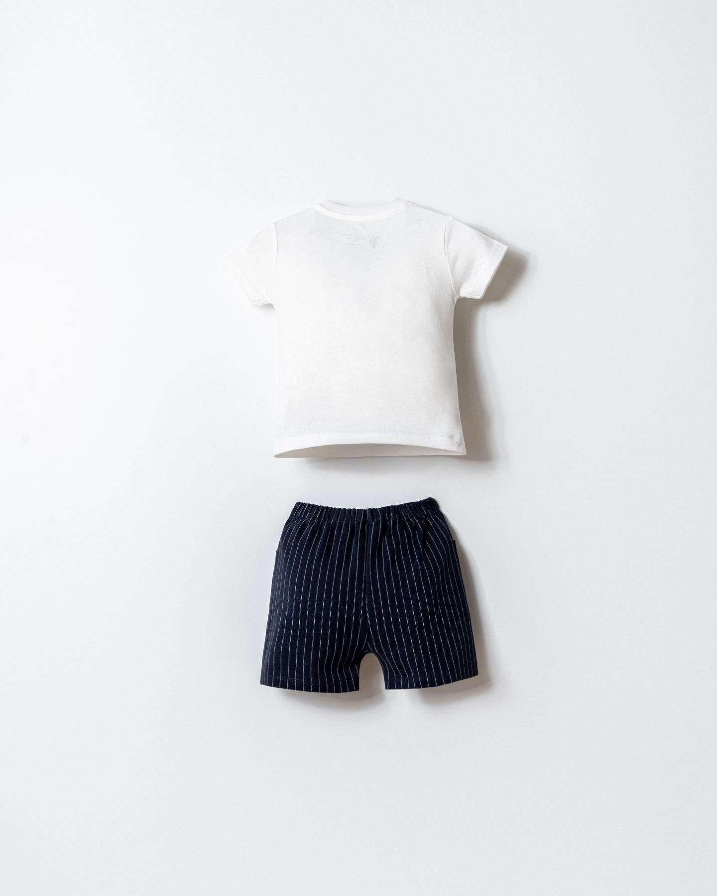 Modern logo baskılı t-shirt modeli sportif bir görünüm kazandırırken, lastikli bel şort tasarımı bebeğin hareketlerini kısıtlamaz. Günlük kullanım, dış giyim ve yaz kombinleri için ideal bir bebek takımıdır.
