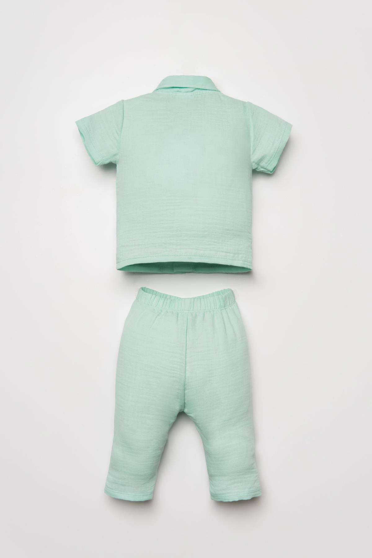 Gömlek yaka düğmeli üst tasarımı ve rahat kalıp alt pantolonu ile hem şık hem konforlu bir kullanım sunar. Yumuşak dokusu bebeğinizin hassas cildine uyum sağlar.